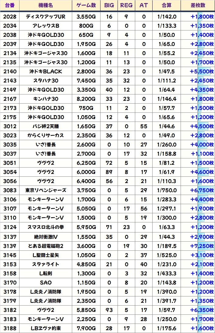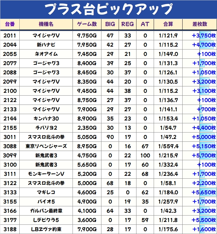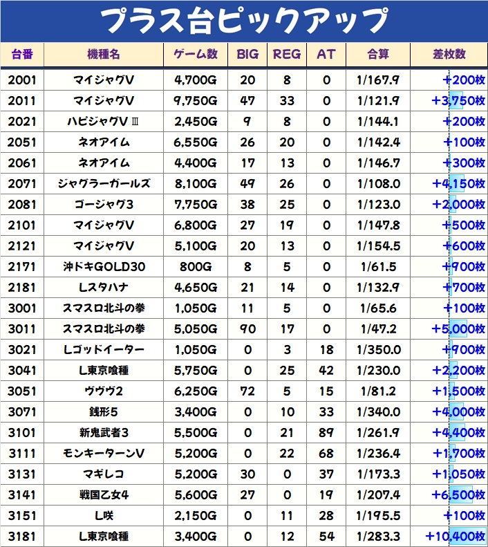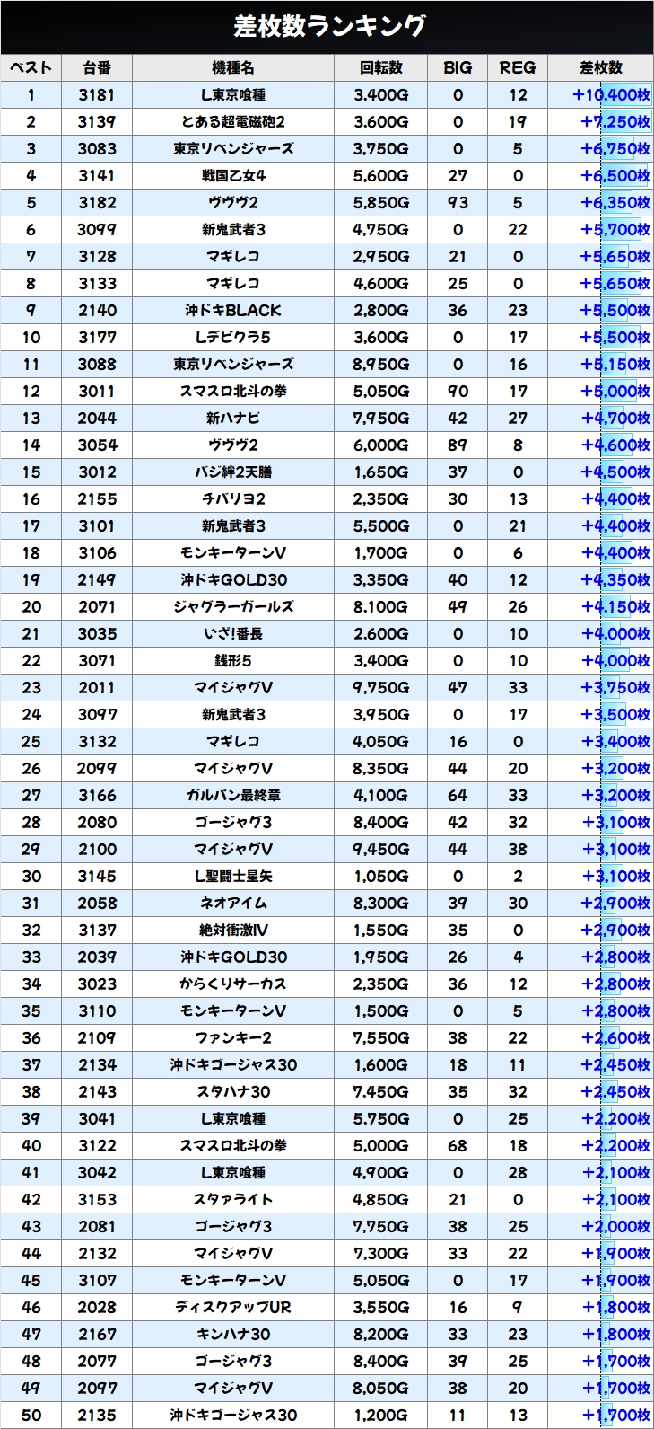上野本館では平均+2283枚と大幅プラスとなっており、+5000枚オーバーの爆出し台も複数確認することができました。