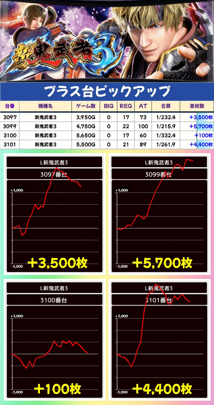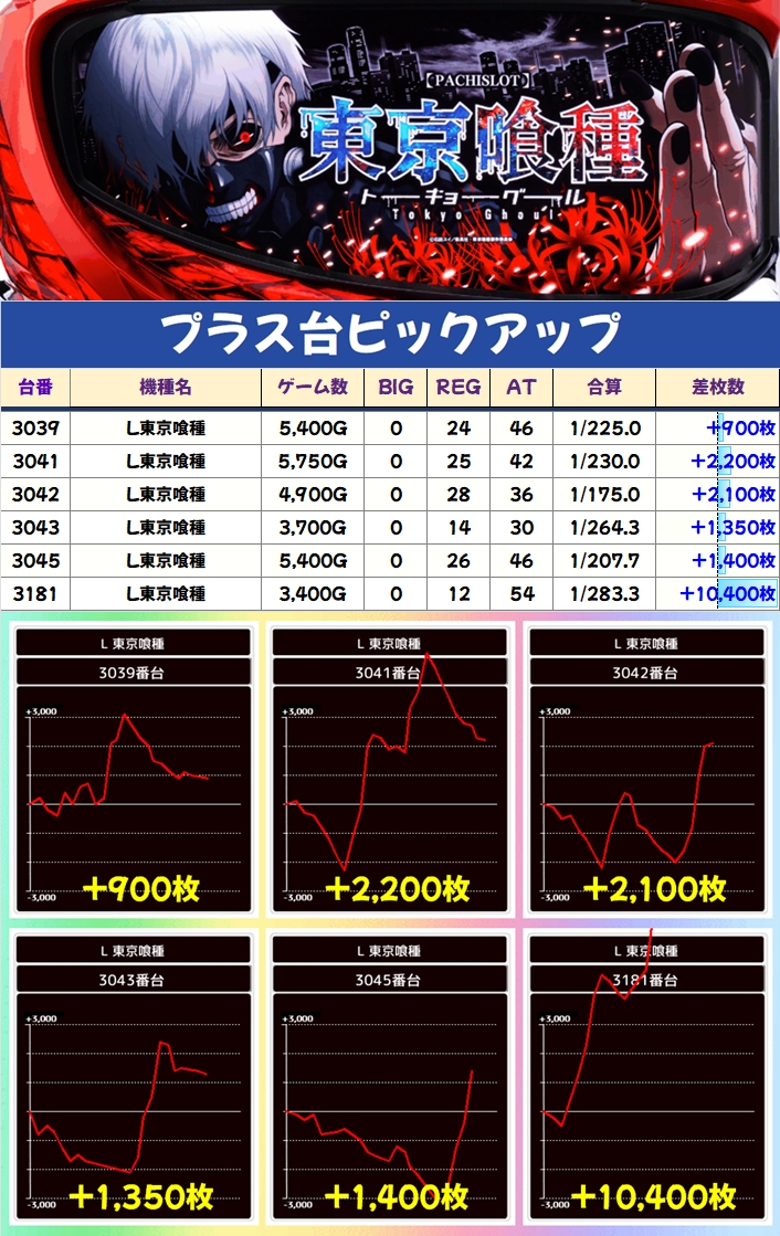 大量出玉も飛び出しており、新鬼武者3からは+5000枚オーバー、東京喰種からは万枚オーバー台が出現していました。