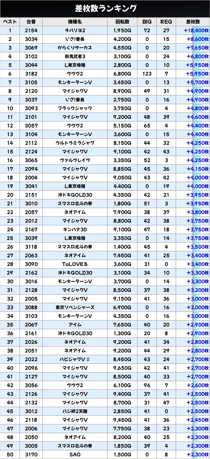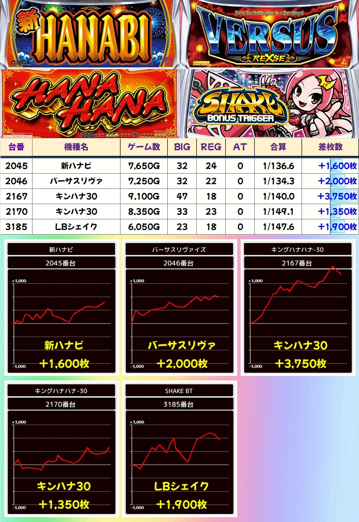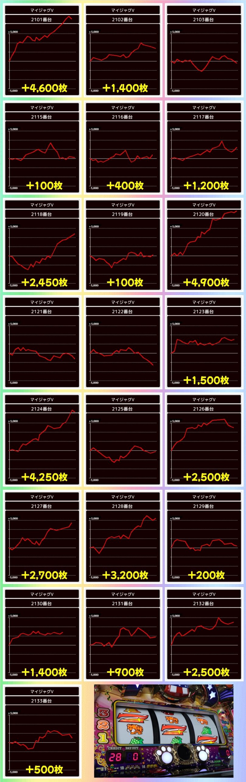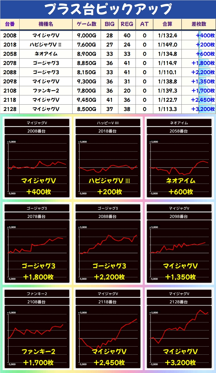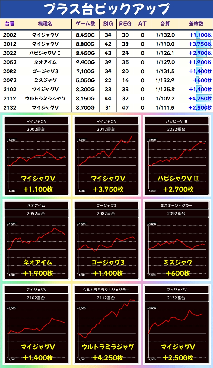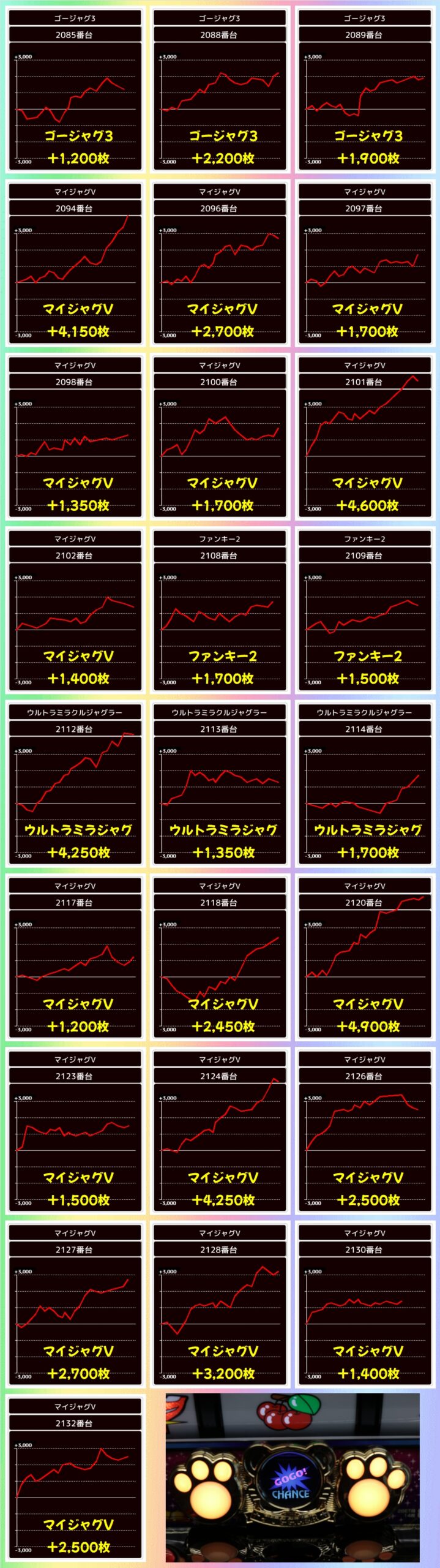 ジャグラーシリーズは9機種中8機種がプラス差枚を記録し、全台系濃厚となった機種も複数確認することができました。