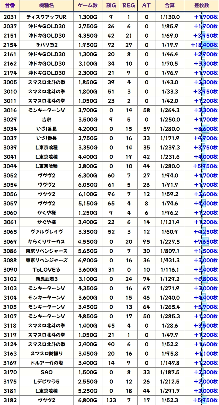 ⑤の日はジャグラーに注目が集まりがちですが、⑤の日はAタイプ系&BT機も力が入っている傾向があり、今回もAタイプ系&BT機から優秀台を複数確認することができました。