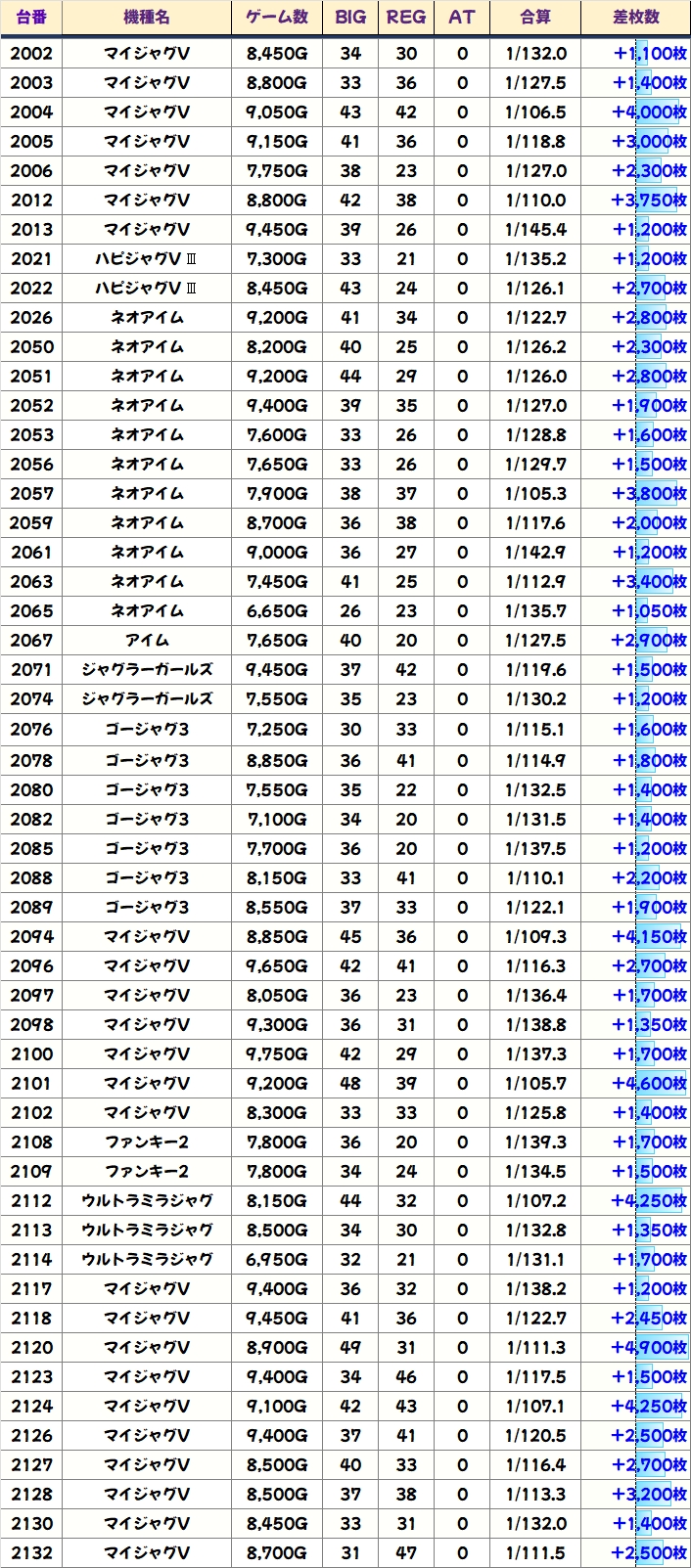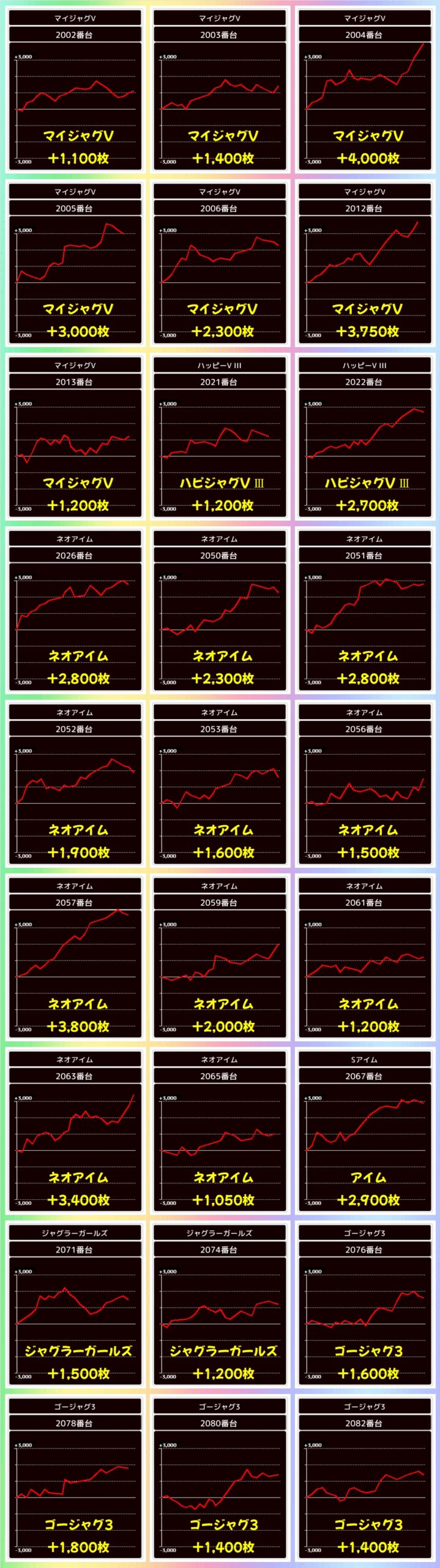 また、マイジャグV以外にもウルトラミラジャグとネオアイムが全台系濃厚の結果になっており、マイジャグV以外も強いことが分かる結果に!