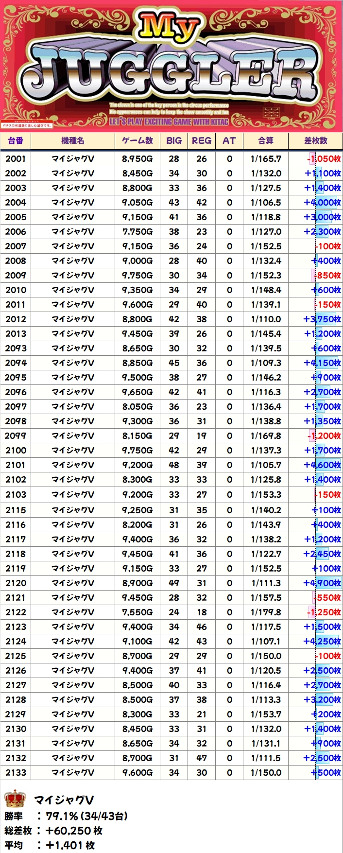 勝率34/43台、平均+1401枚と優秀な出玉を残しており、上野本館=マイジャグVということを再認識する結果になっていました。