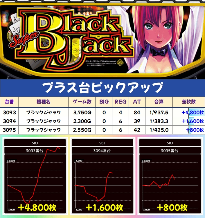 3階告知時は3階から優秀機種が毎回登場しており、今回はバジ絆2天膳とスーパーブラックジャックの2機種が優秀な結果に!