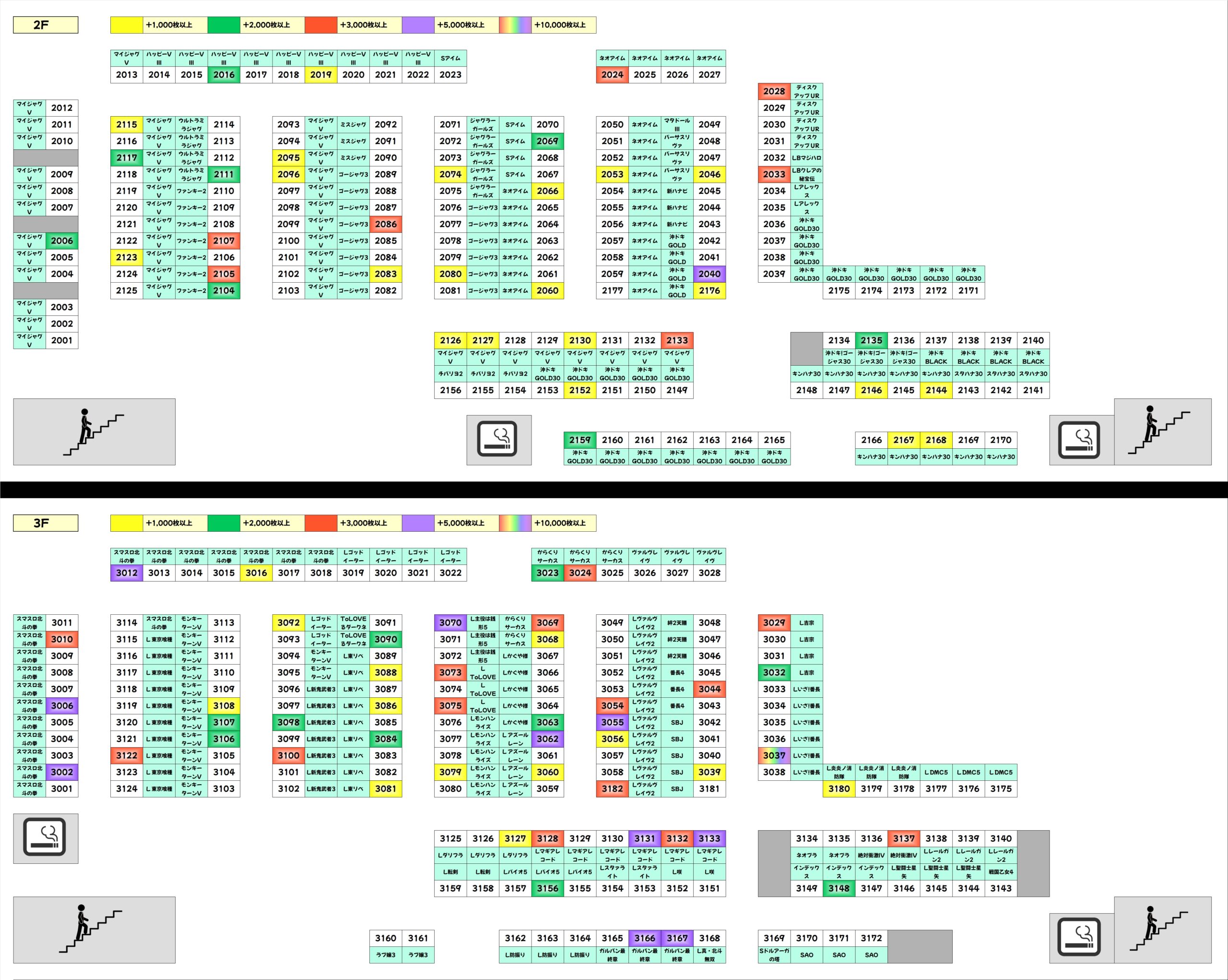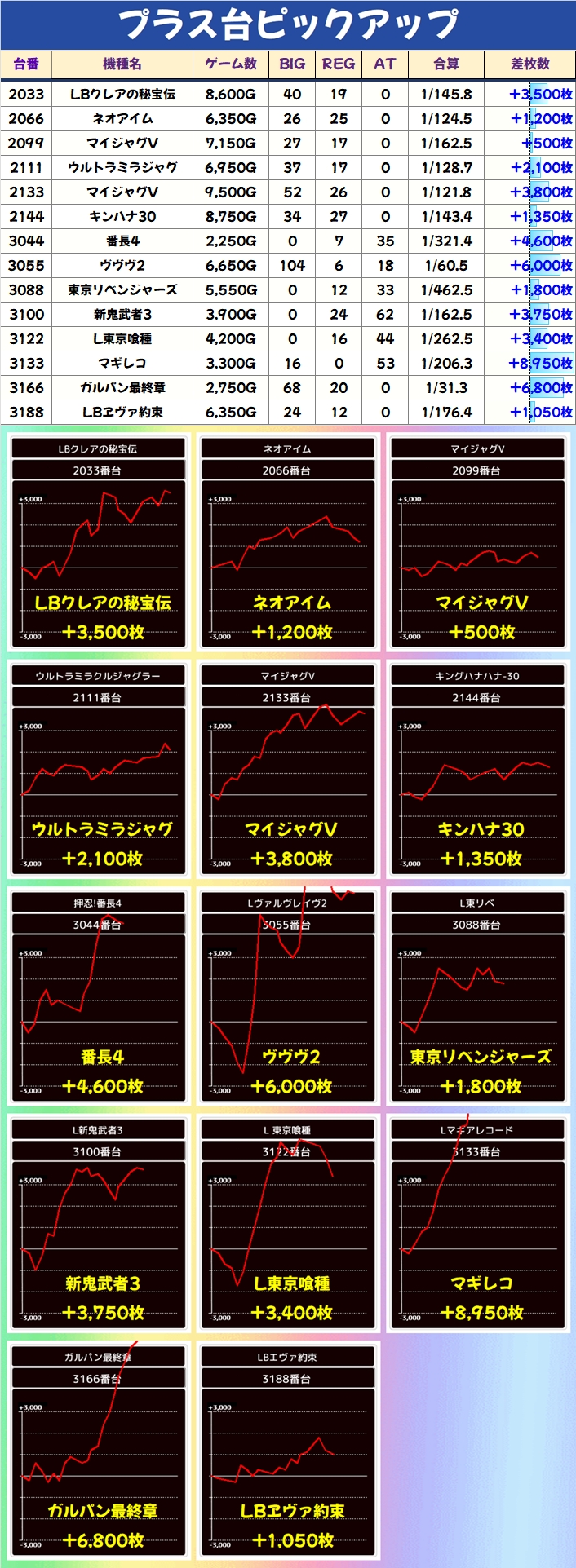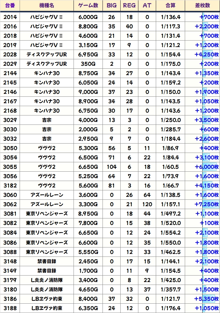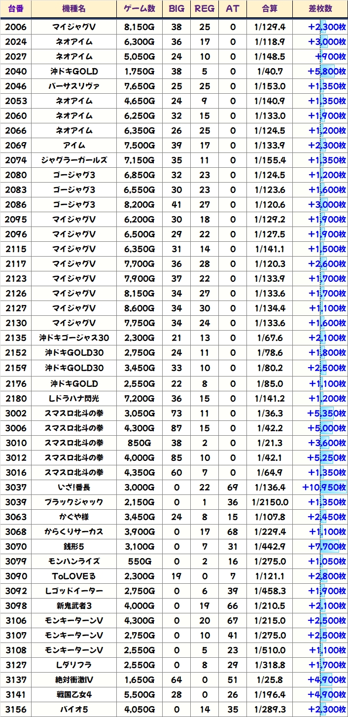 優秀台を多数確認することができたため、各機種のプラス差枚数台をピックアップしていました!