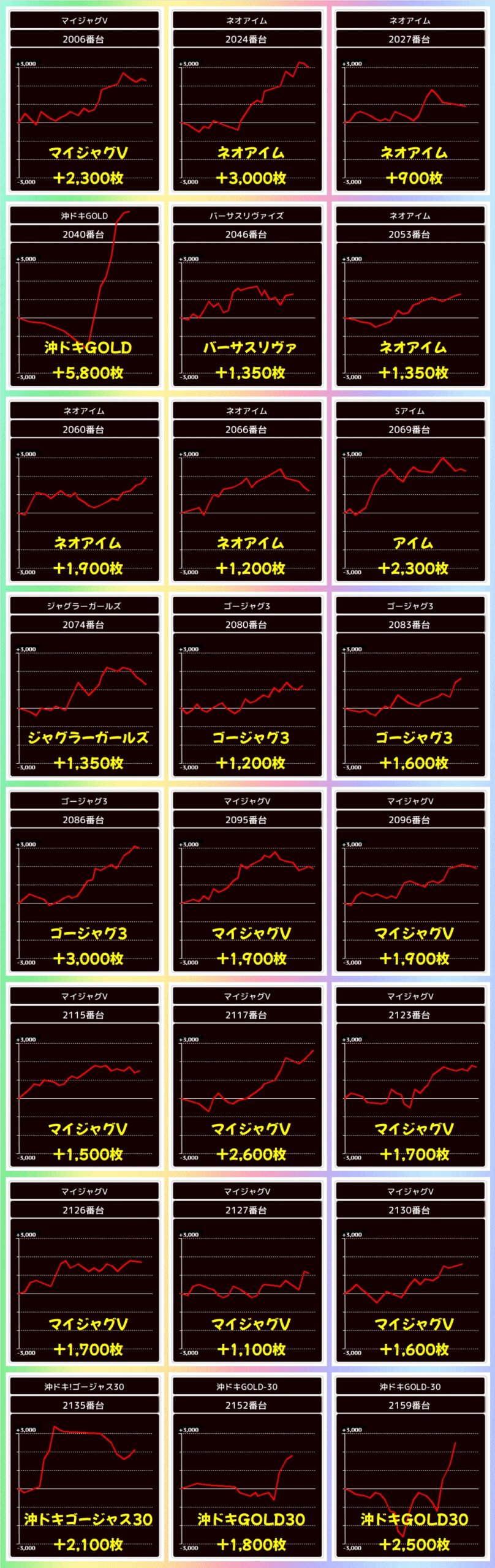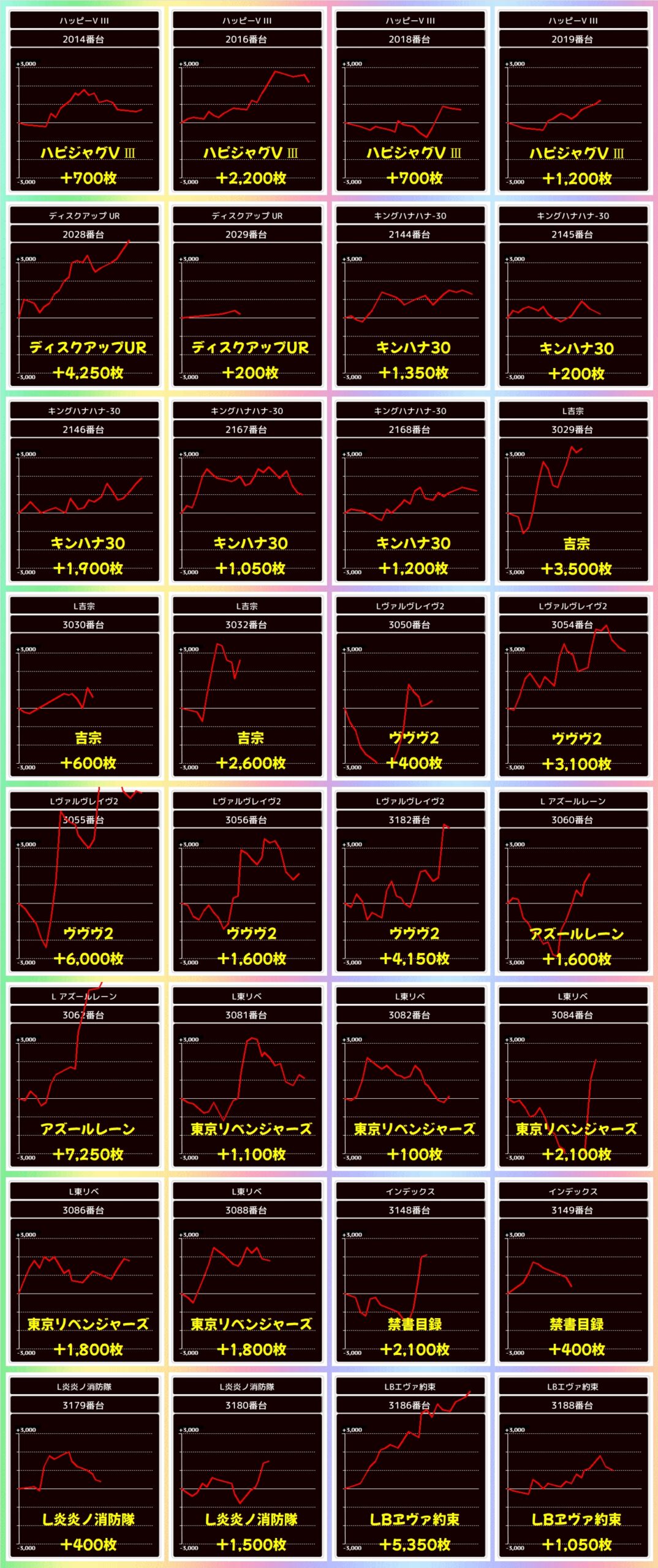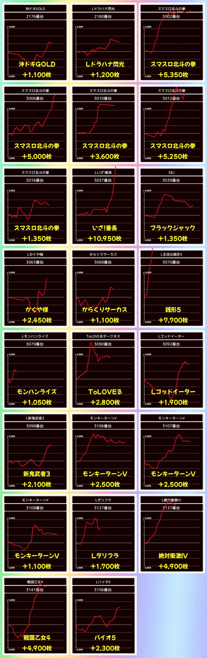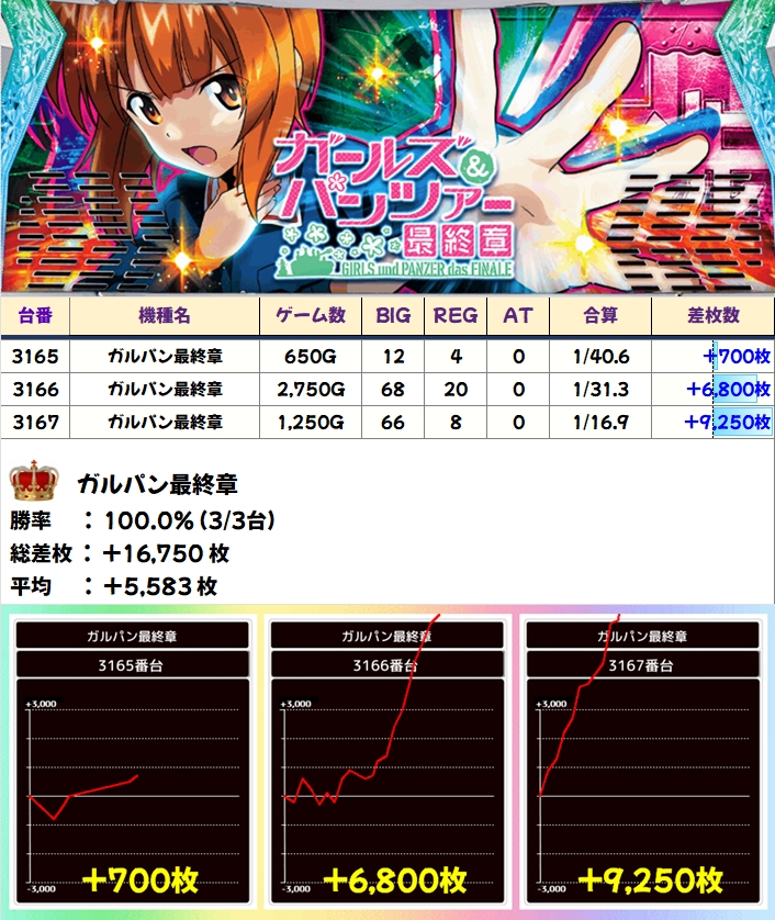 この日は全台系濃厚機種を6機種確認でき、ガルパン最終章は平均+5583枚、マギレコは平均+4075枚と強烈な出玉もアリ!