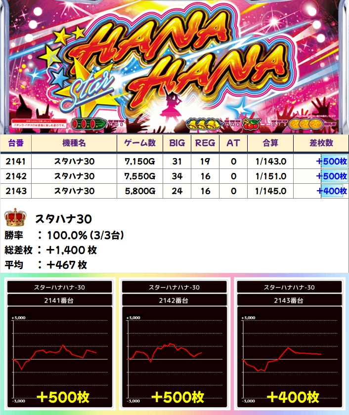 【全台系濃厚】スタハナ30(3/3台+)→平均+467枚