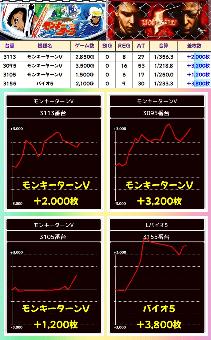 モンキーターンVとバイオ5からは優秀台を確認することができ、こちらも末尾⑤が特に当たりだったようです。
