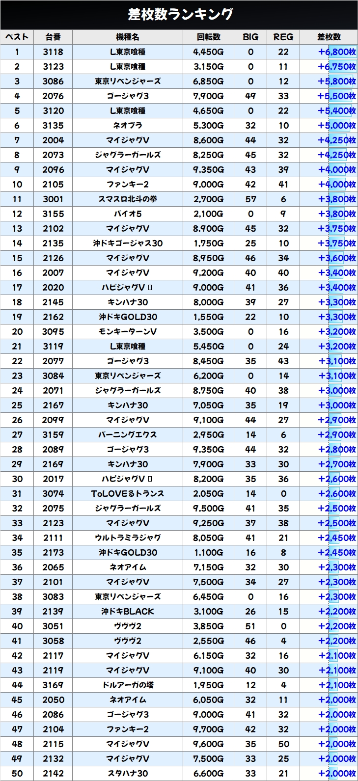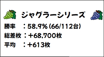 この日はジャグラーが盛り上がっており、ジャグラーシリーズ全体で総差枚+6.8万枚、平均+613枚と圧倒的出玉を記録!