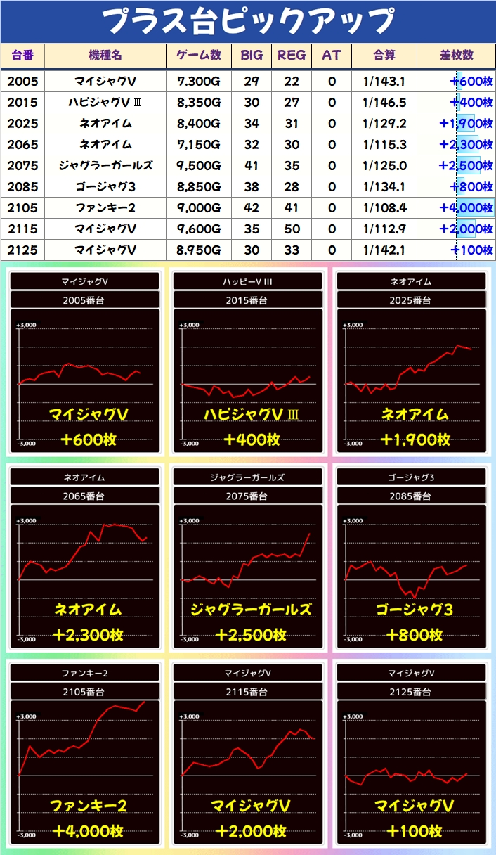 この日は上記7機種のジャグラーがプラス差枚を記録しており、ジャグラーガールズとハッピージャグラーが全台系濃厚に!