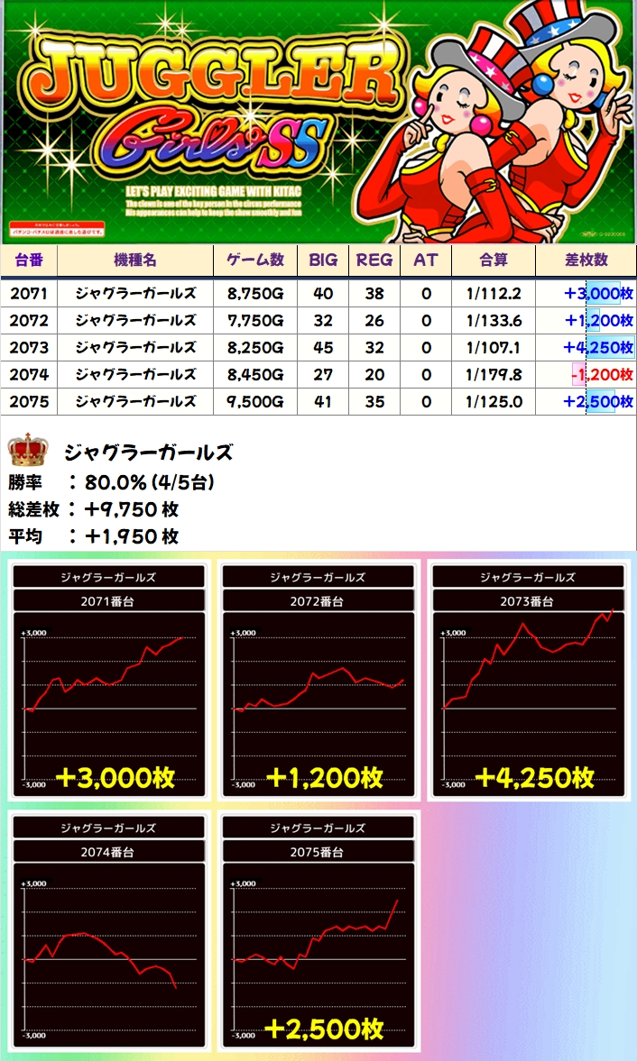 【全台系濃厚】ジャグラーガールズ(4/5台+)→平均+1,950枚