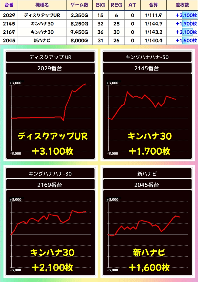 そんな今回の⑤のつく日でしたが、今回もお宝台が多数用意されていたようで、ホール全体で大幅プラスを記録!