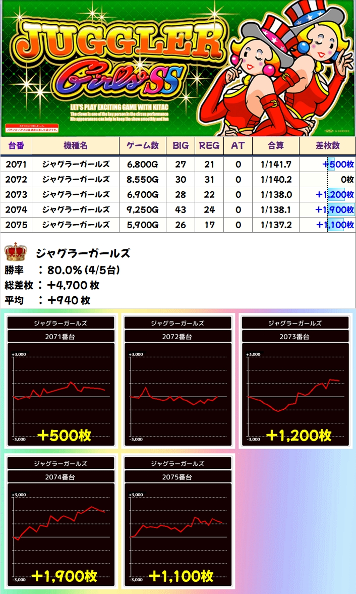 【全台系濃厚】ジャグラーガールズ(4/5台+)→平均+940枚