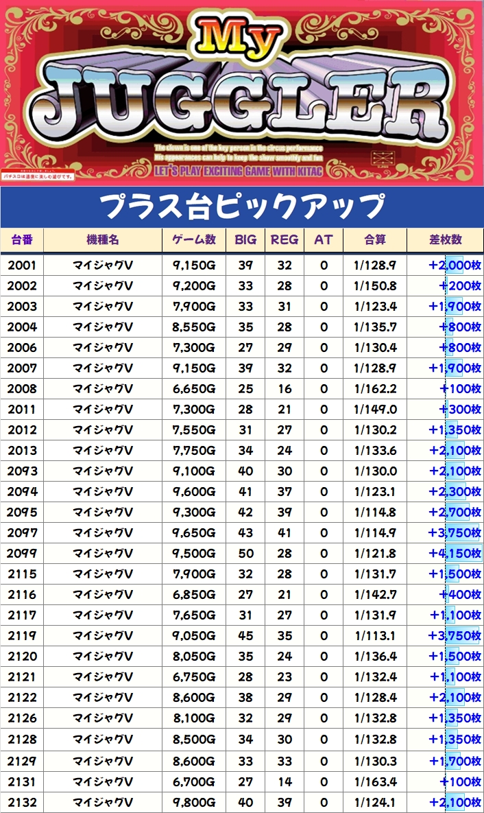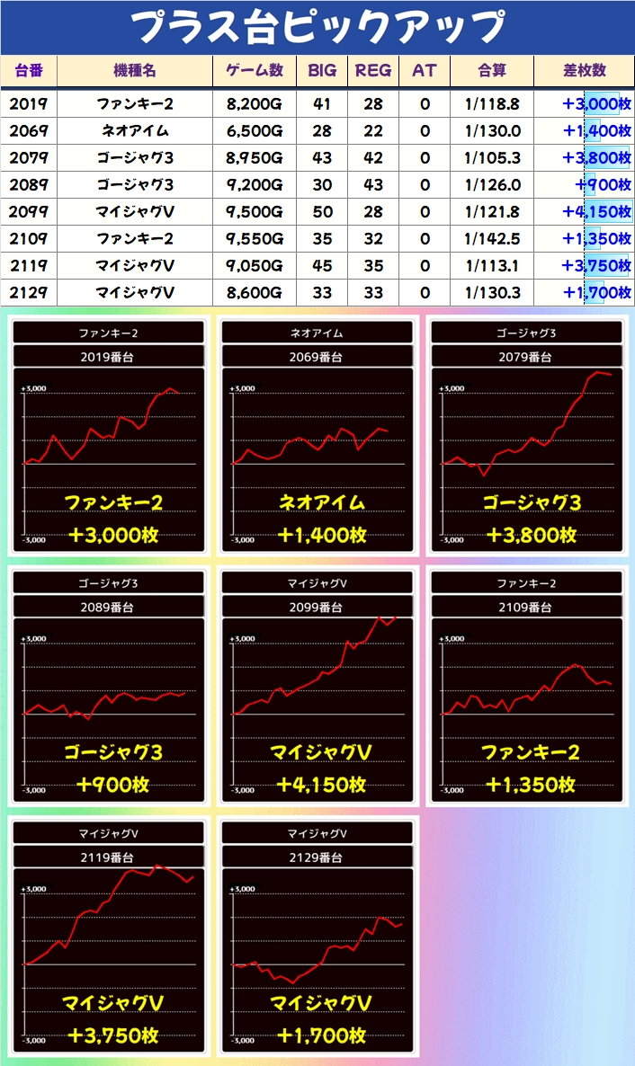 今回はジャグラーが主役となっていましたが、ジャグラー以外にもお宝台が多数用意されていたようで、幅広い機種から単品での優秀台を確認!