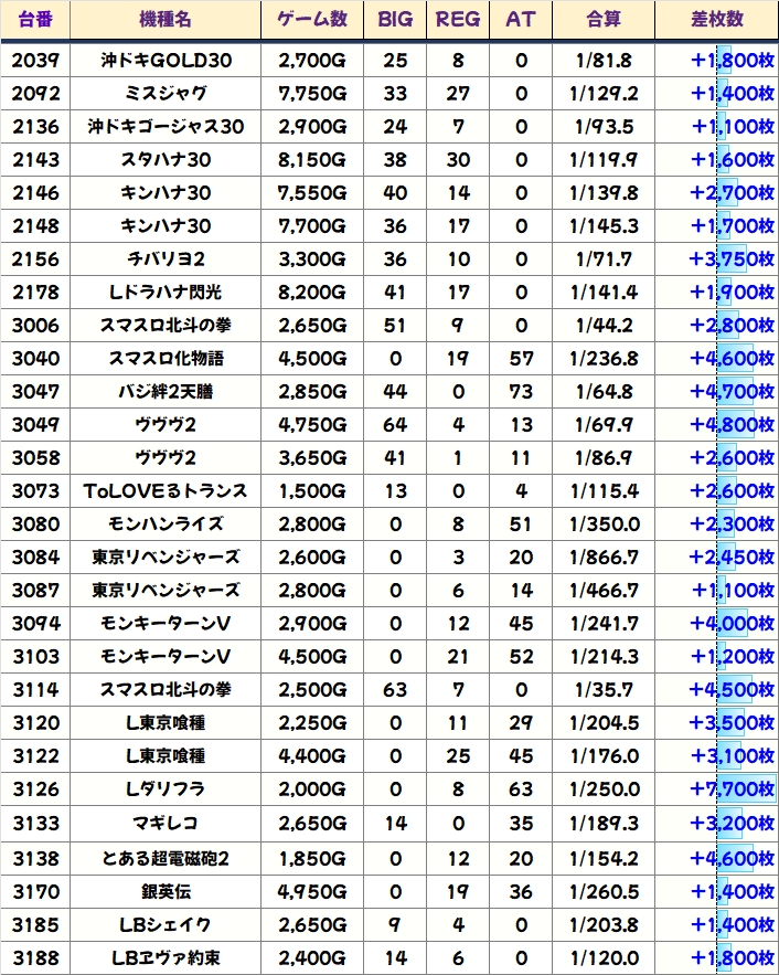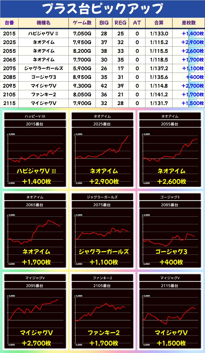 1台稼働不足の台がありますが、機種全体の結果と⑤の日ということを考えると全台系で間違いないのかなと。