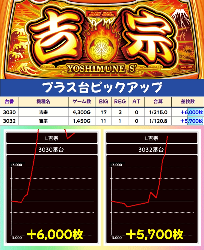 上記の機種からは優秀台が複数出現しており、吉宗からは+6000枚と+5000枚超の大量出玉が飛び出していました。