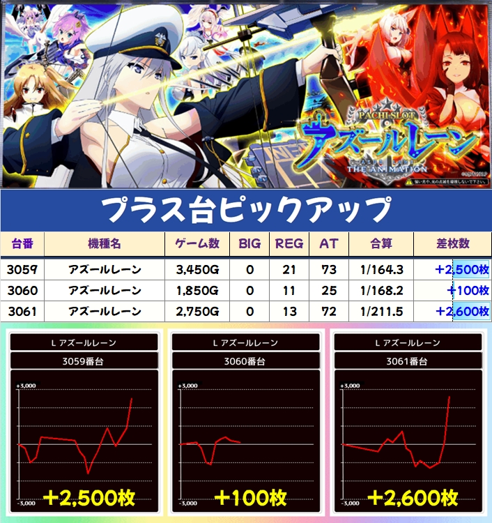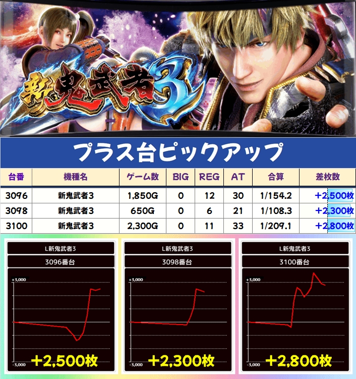 3階告知時は3階から優秀機種が毎回登場しており、今回は吉宗・アズールレーン・新鬼武者3の3機種が優秀な結果に!