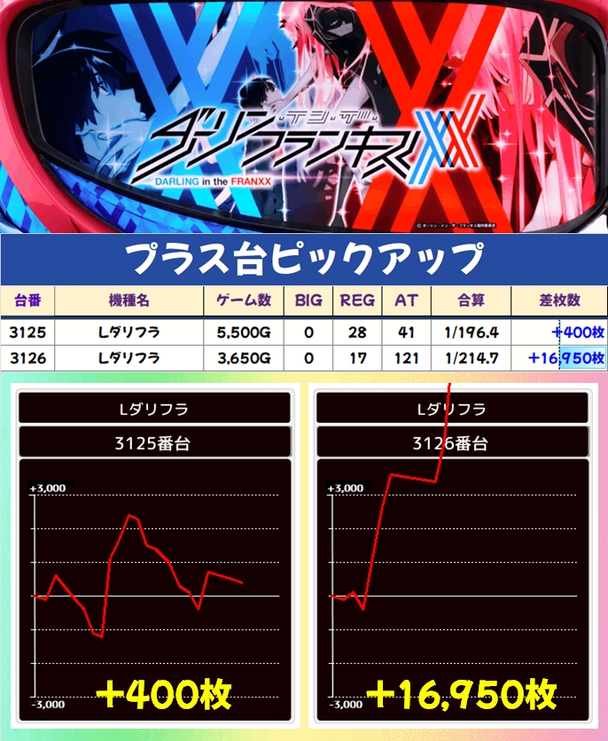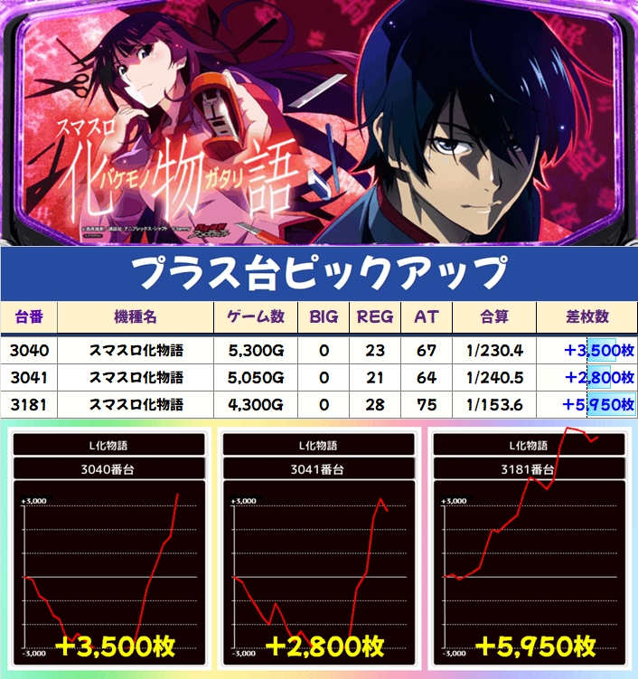 さらに、新台の化物語にも優秀台を多数確認でき、少台数機種からもダリフラのコンプリート目前の台を筆頭に優秀台が多数出現していました。