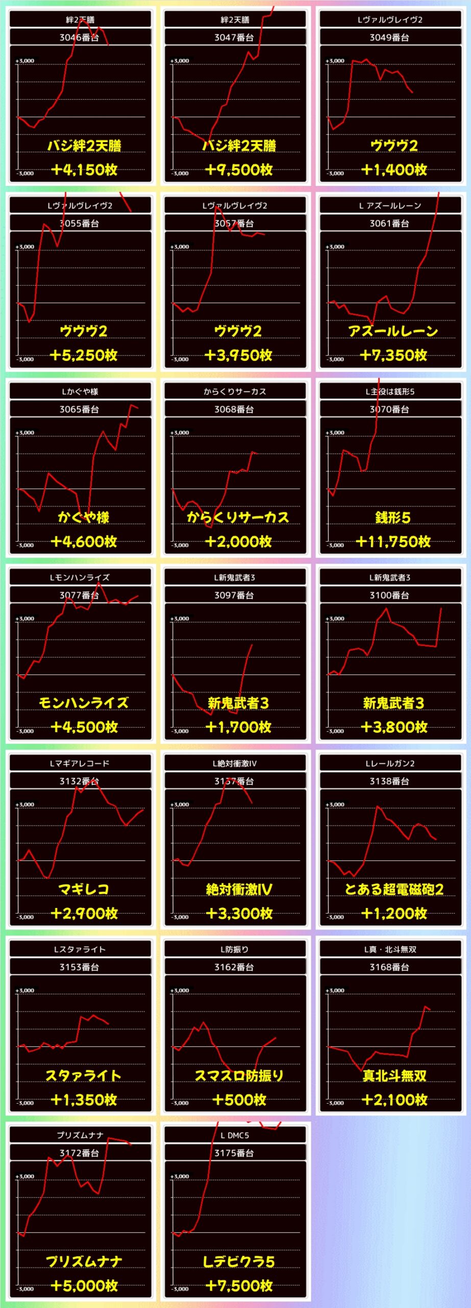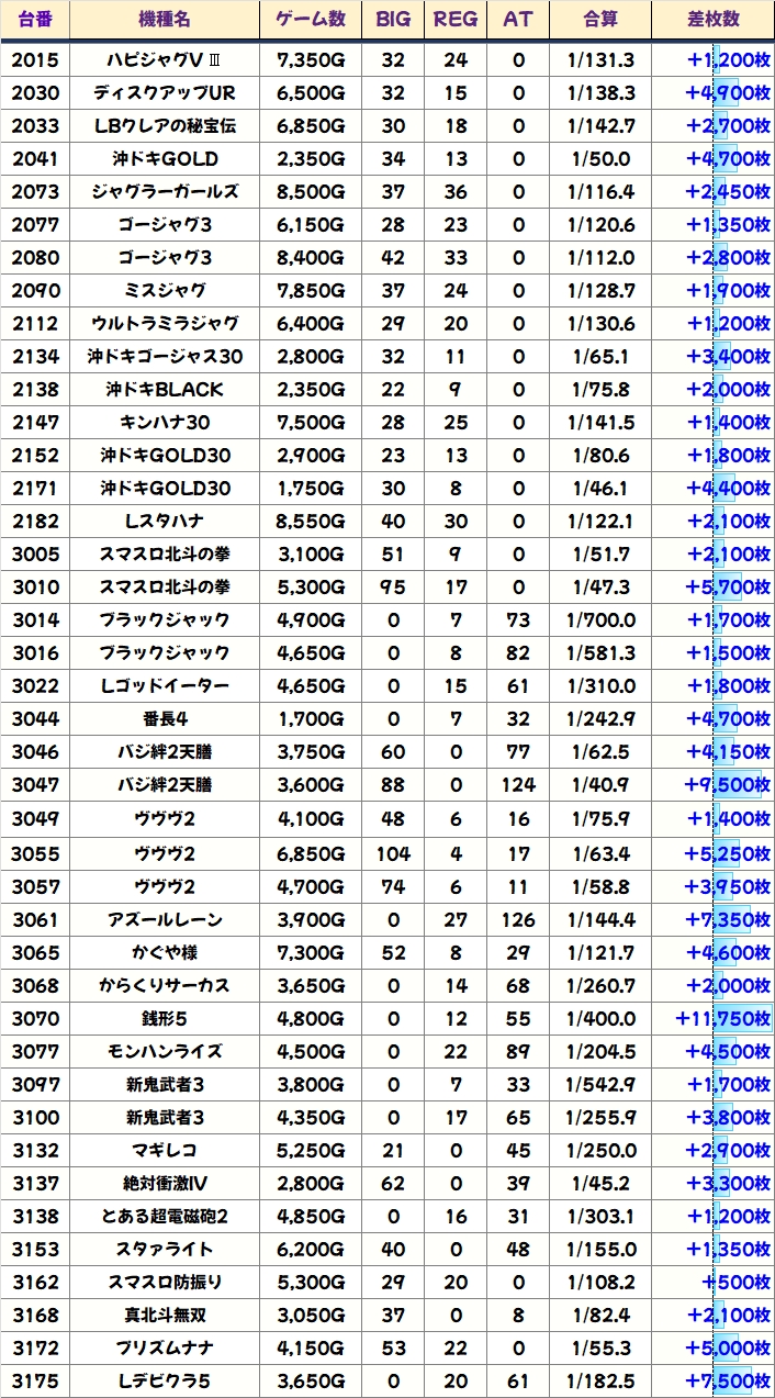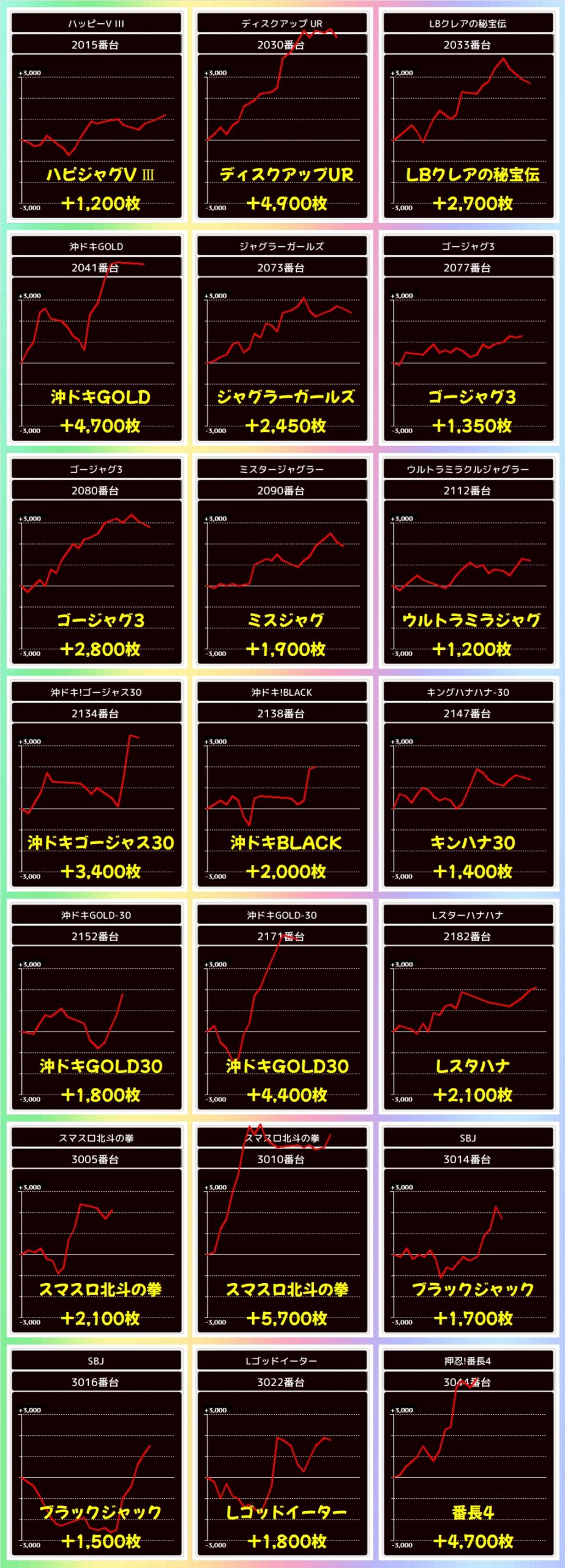 今回も機種イチ以上でお宝台が投入されていたようで、幅広い機種から優秀台を確認!