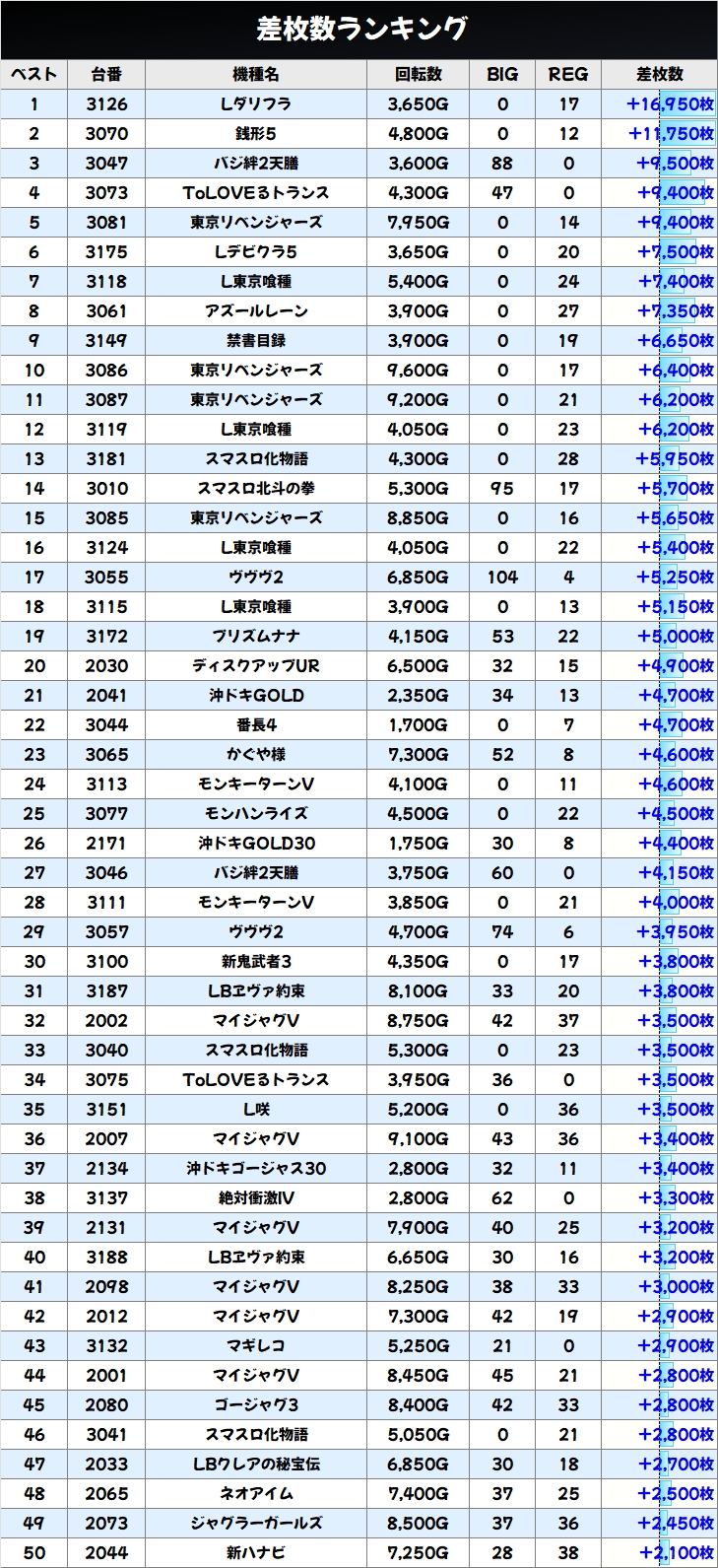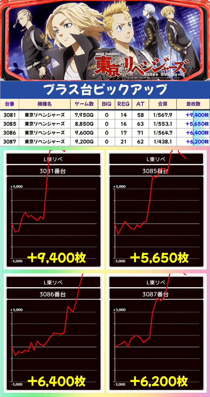 なかでも東リベは半分以上の台が5,000枚overと稼働ゲーム数も付いているため、全台系だった可能性も考えられます。
