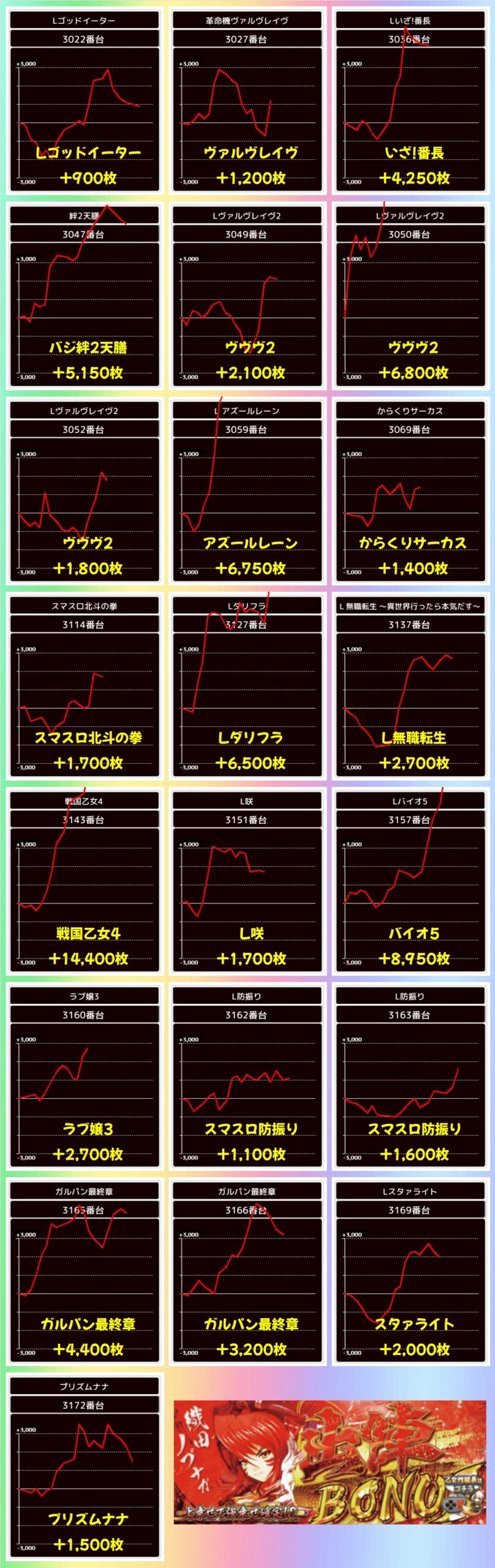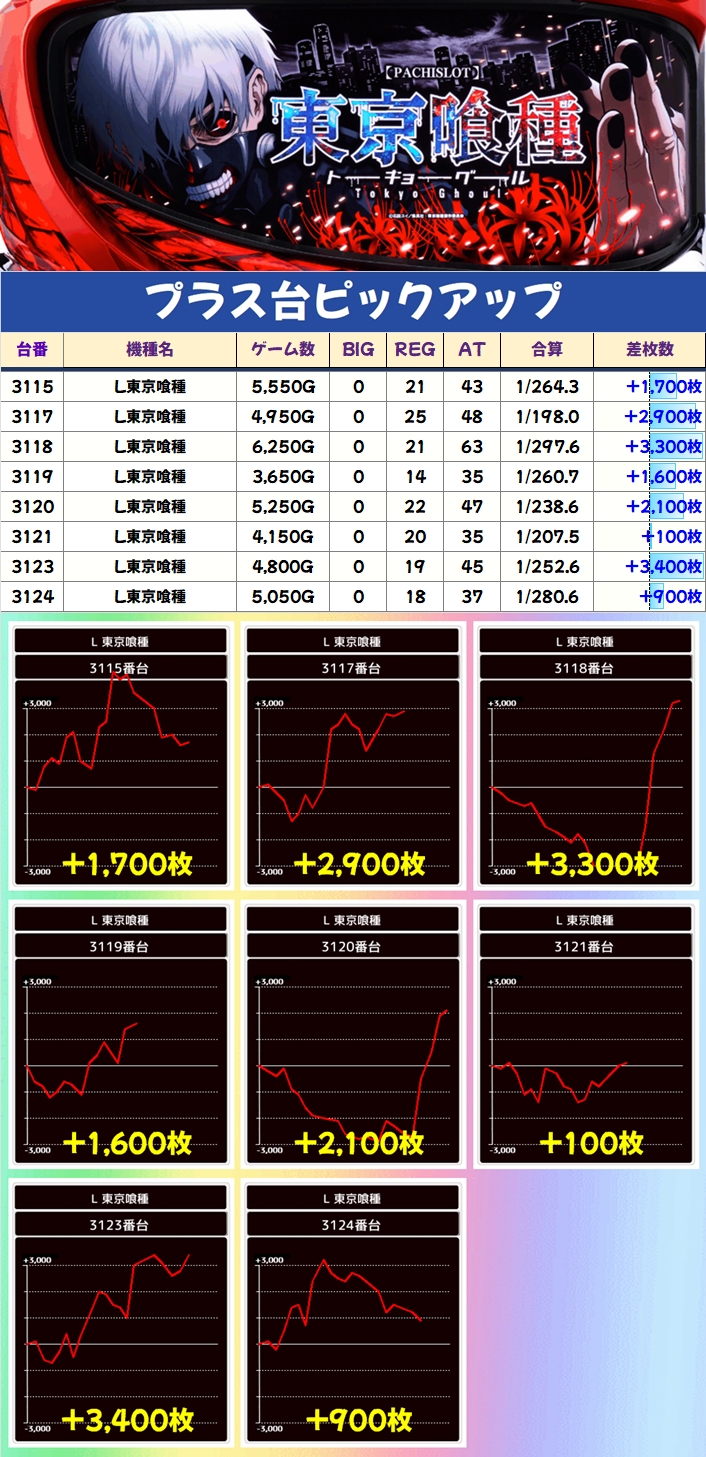 また、準新台の化物語も1/2系濃厚となっており、+6000枚オーバーに加えて+4000枚オーバー台が複数出現していました!