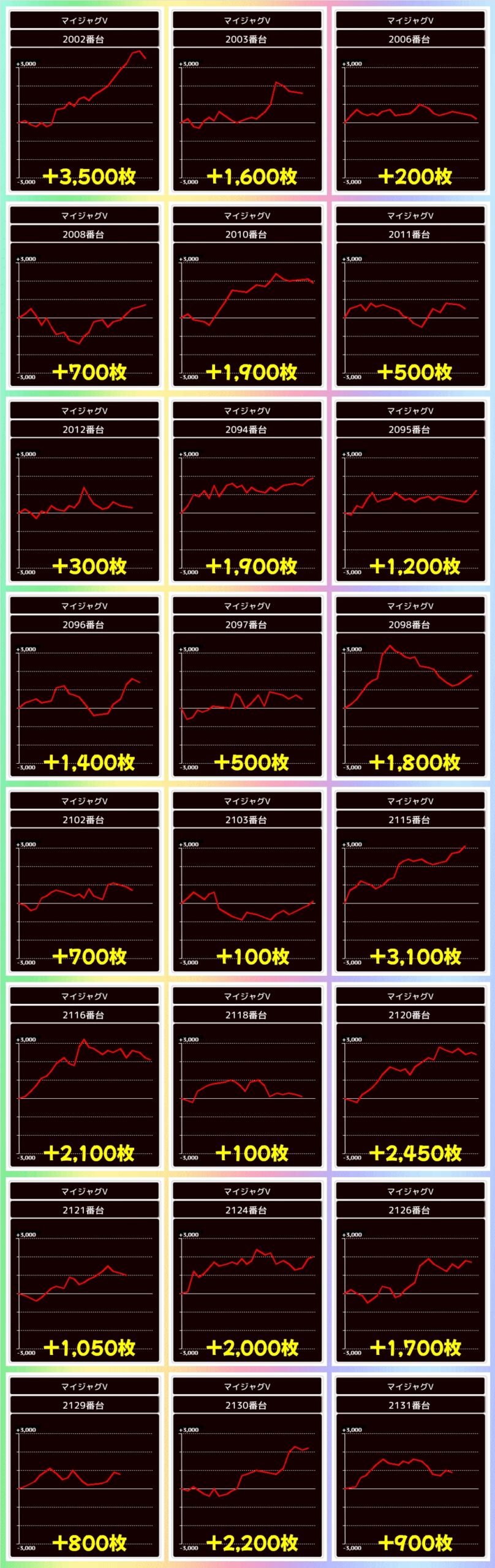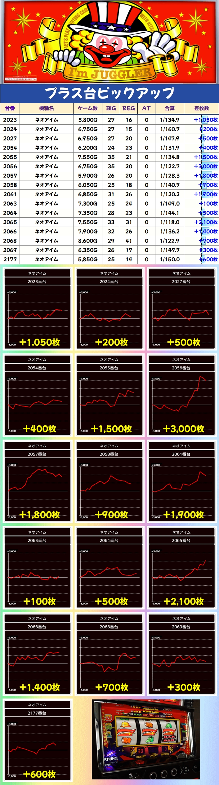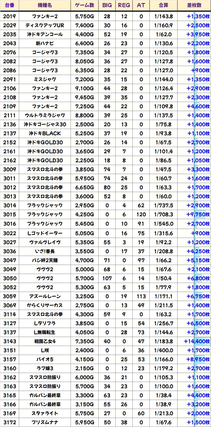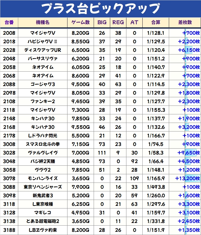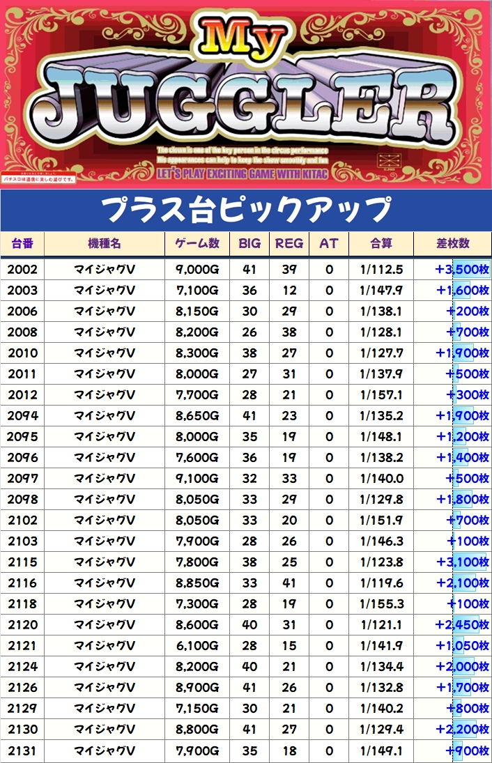 この日はメイン機種がしっかり高配分になっており、看板機種のマイジャグも半分以上の台がプラス差枚と好結果に!