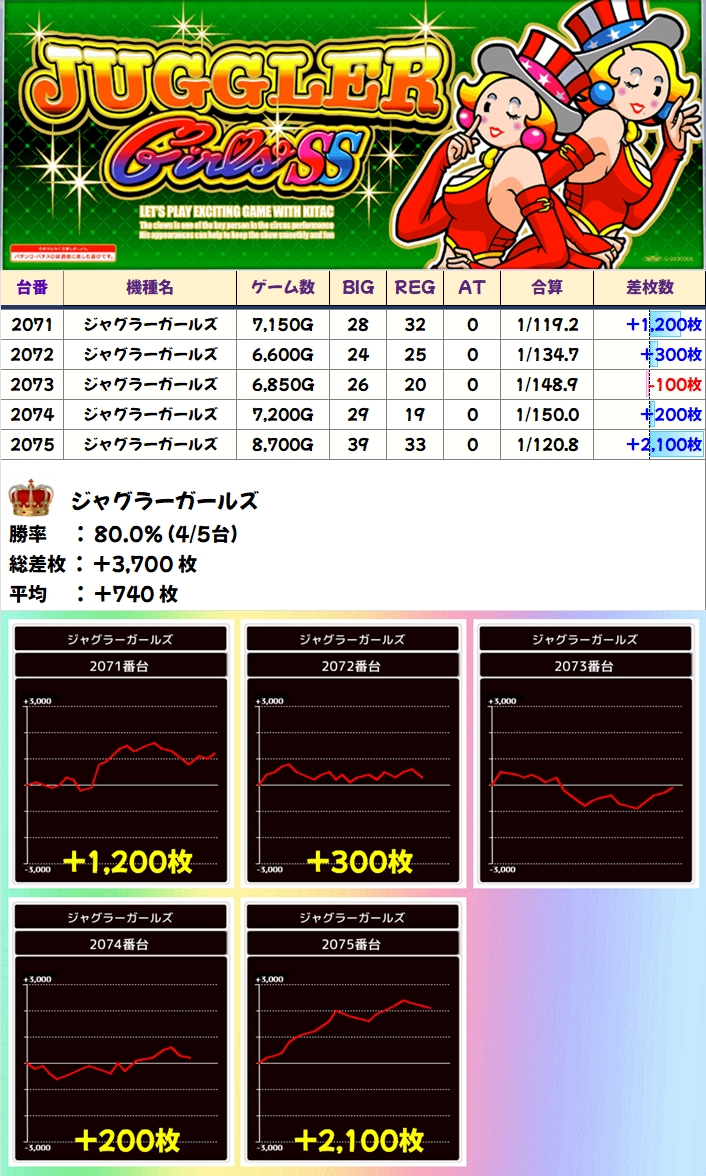 【全台系濃厚】ジャグラーガールズ(4/5台+)→平均+740枚