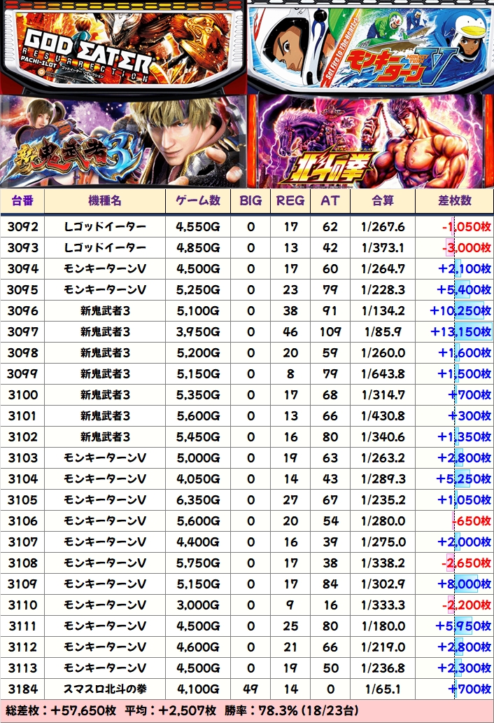 【島仕掛け】モンキーV・新鬼武者3・ゴッドイーター(16/23台+)→平均+2,507