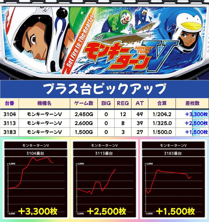 また、⑤のつく日ということで、⑤纏わりの機種としてモンキーターンVも高配分になっていたようです。