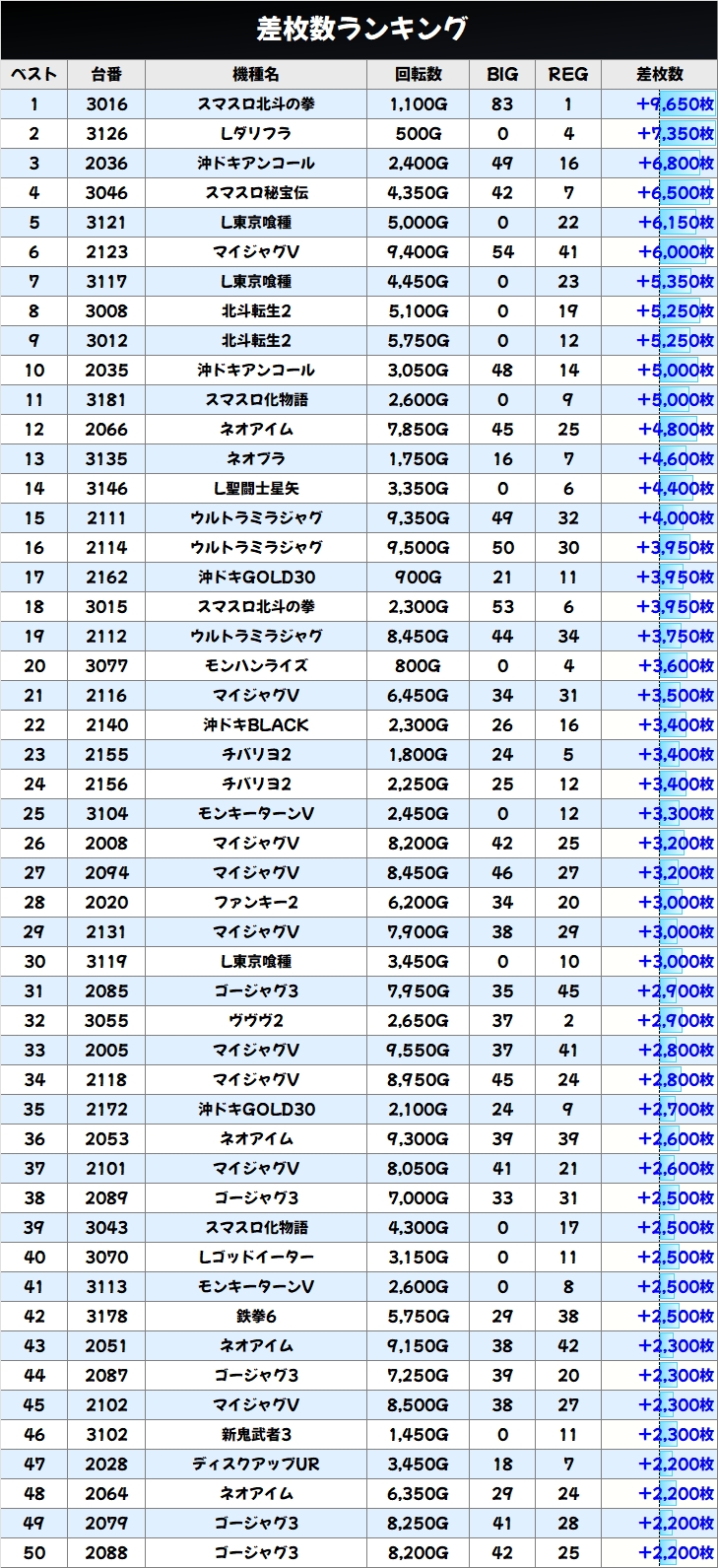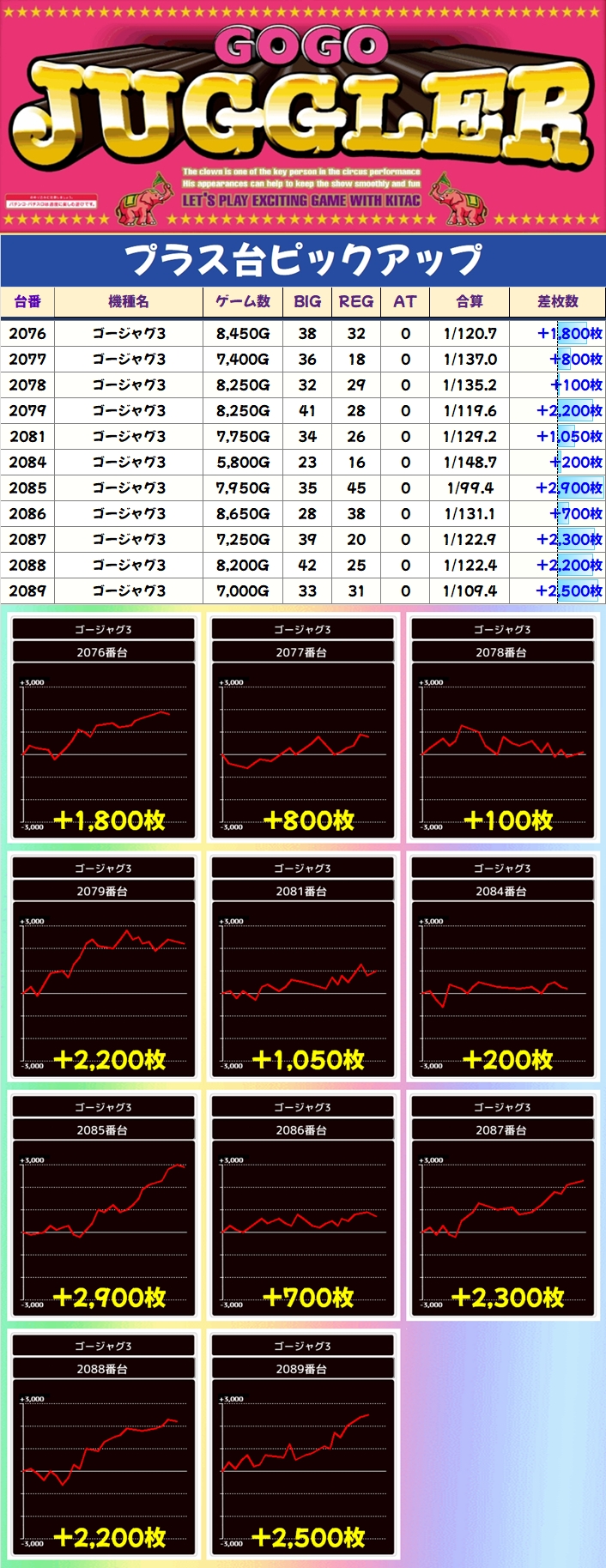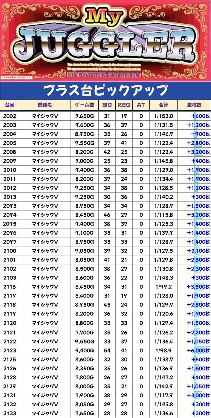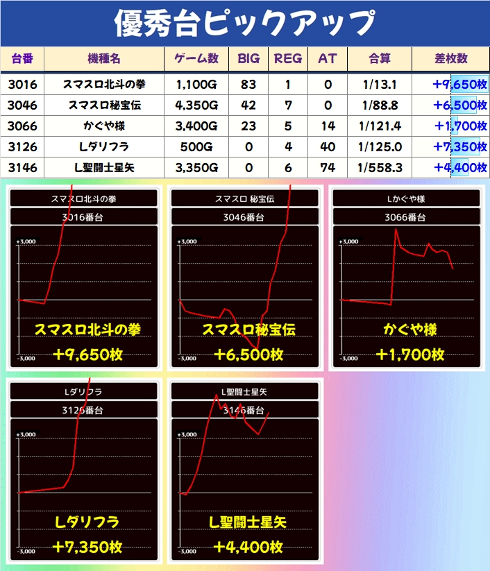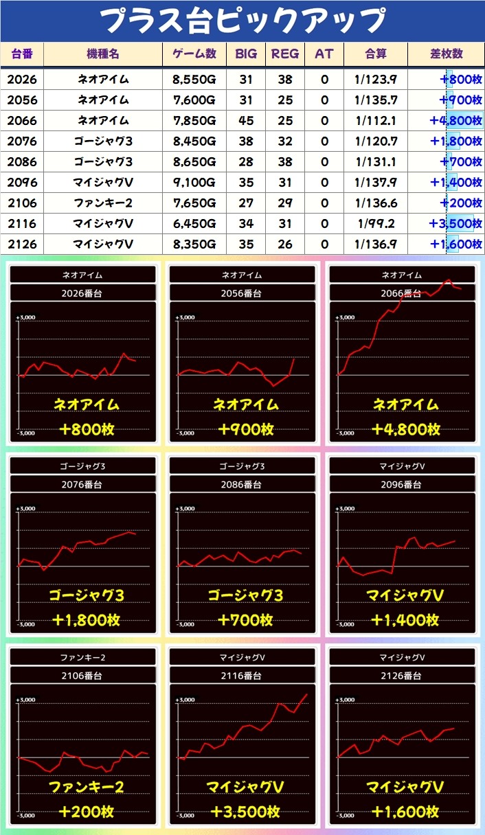 今回はジャグラーが主役となっていましたが、ジャグラー以外にもお宝台が多数用意されていたようで、幅広い機種から単品での優秀台を確認!
