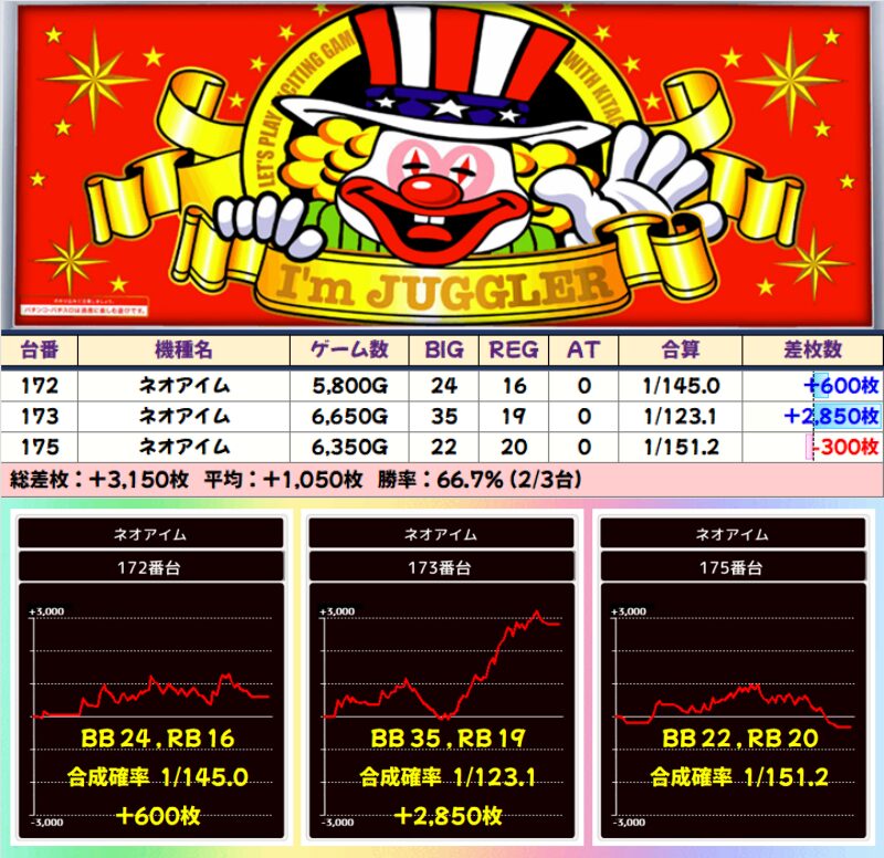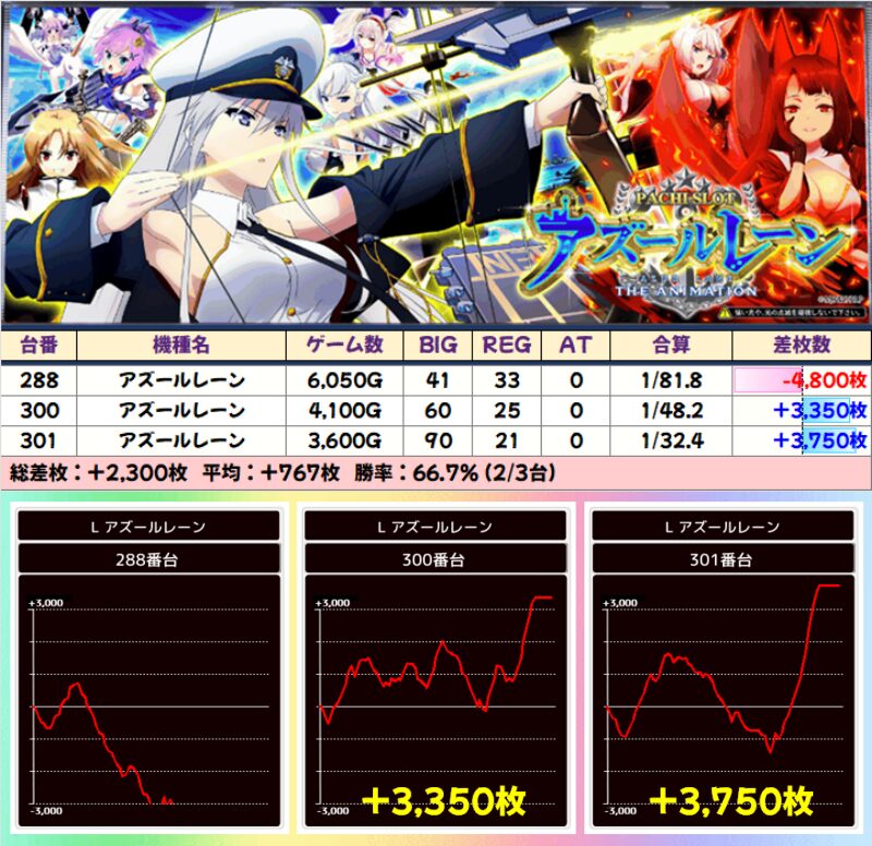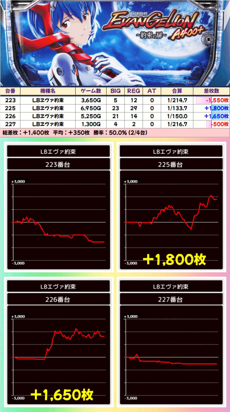 この日の共闘も、高配分だった機種が多数ありました。なかでもクレアの秘宝伝は、全台がプラス差枚という見事な結果でした。その他、アズールレーンやエヴァ約束、ToLOVEるトランス、ネオアイム、ミスタージャグラーといった機種は、ニブイチ以上の高配分でした。またこの日は、エヴァンゲリオンのキャラクターのひとり、渚カヲルの誕生日でもありました。