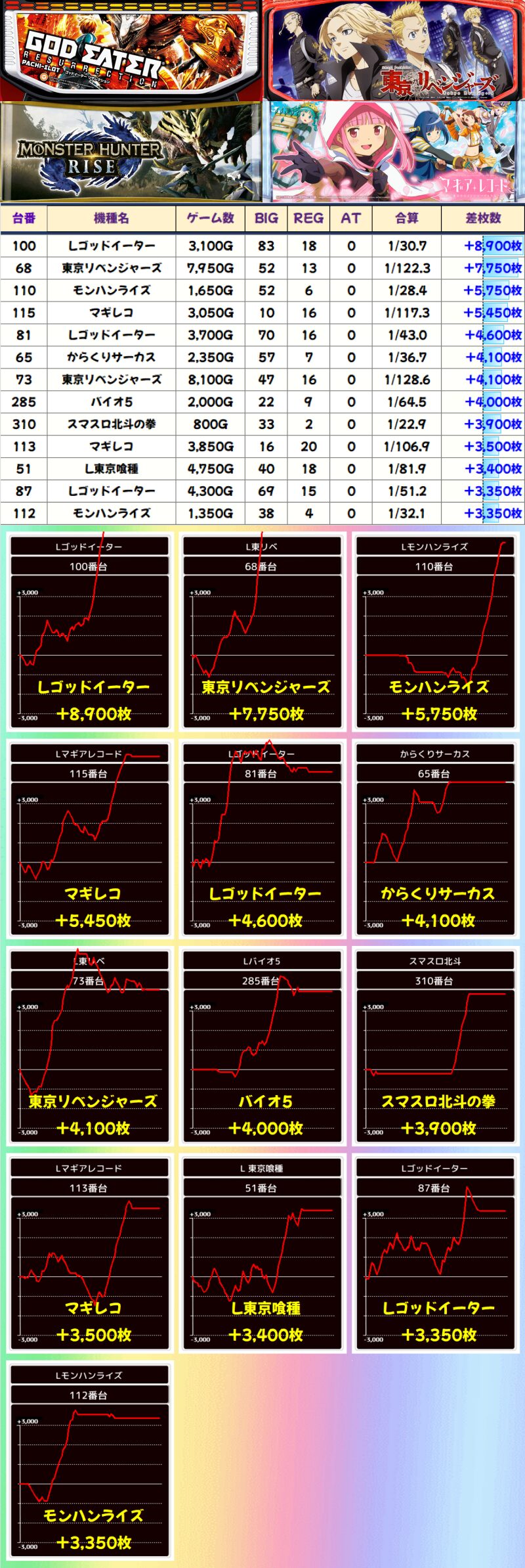 この日も上記の仕掛け機種以外に、単品の優秀台が豊富にありました。メインどころの機種を中心に、店内いたるところに散らばっていたようです。なかには、+8900枚もの差枚を獲得したゴッドイーターや+7750枚の東京リベンジャーズなど、多くの差枚を記録した台もありました。