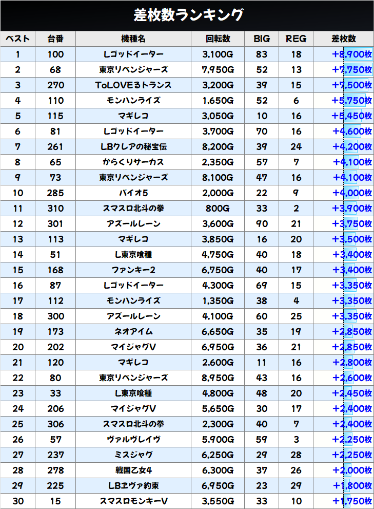 この日の差枚数ランキングはこちら。+8900枚を記録したゴッドイーターが1位。+7000枚オーバーを記録した東京リベンジャーズとToLOVEるトランスが2位と3位にランクインしました!4位以下にも様々な機種がランクインし、28台が2千枚オーバーを記録しました!