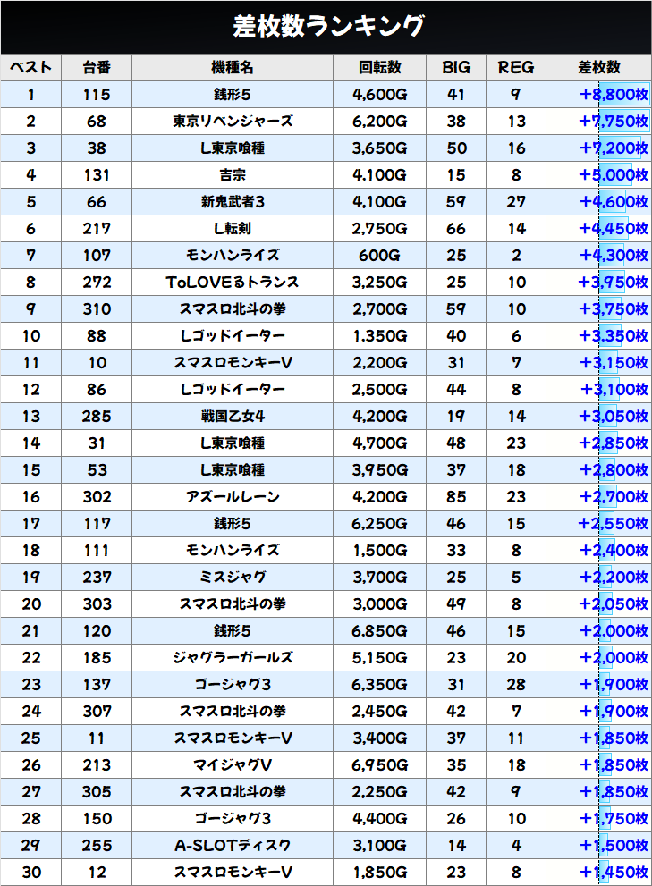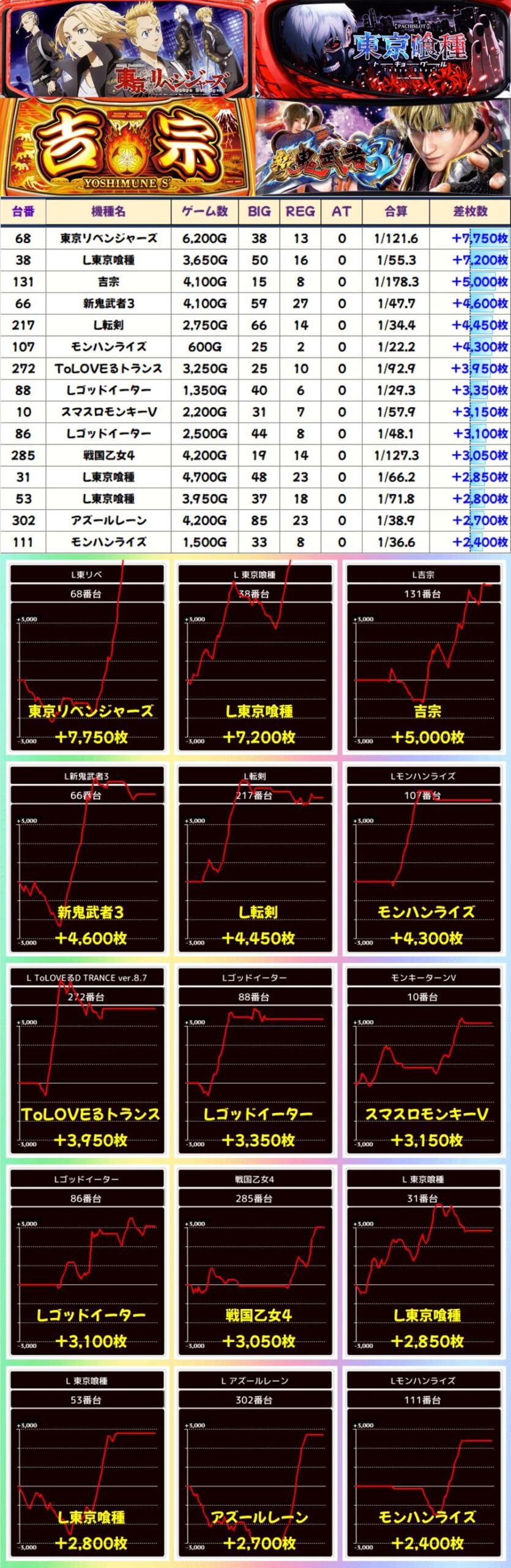 高配分機種以外にも、多くの単品優秀台がありました。メインどころの機種を中心に、店内いたるところに散らばっていたようです。なかには、+7750枚もの差枚を獲得した東京リベンジャーズや+7200枚の東京喰種など、多くの差枚を記録した台もありました。