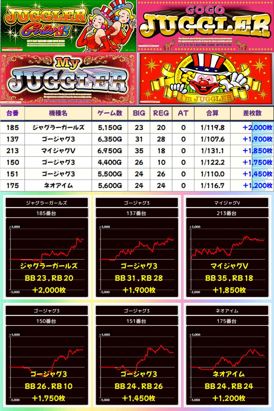 ミスジャグ、スマスロ北斗の拳、ディスクアップUR、新ハナビ、主役は銭形5など、この日の共闘も、高配分だった機種が多数ありました。いずれもニブイチ以上の高配分で、なかでも主役は銭形5からはプラス8千枚以上の差枚を獲得した台もありました。