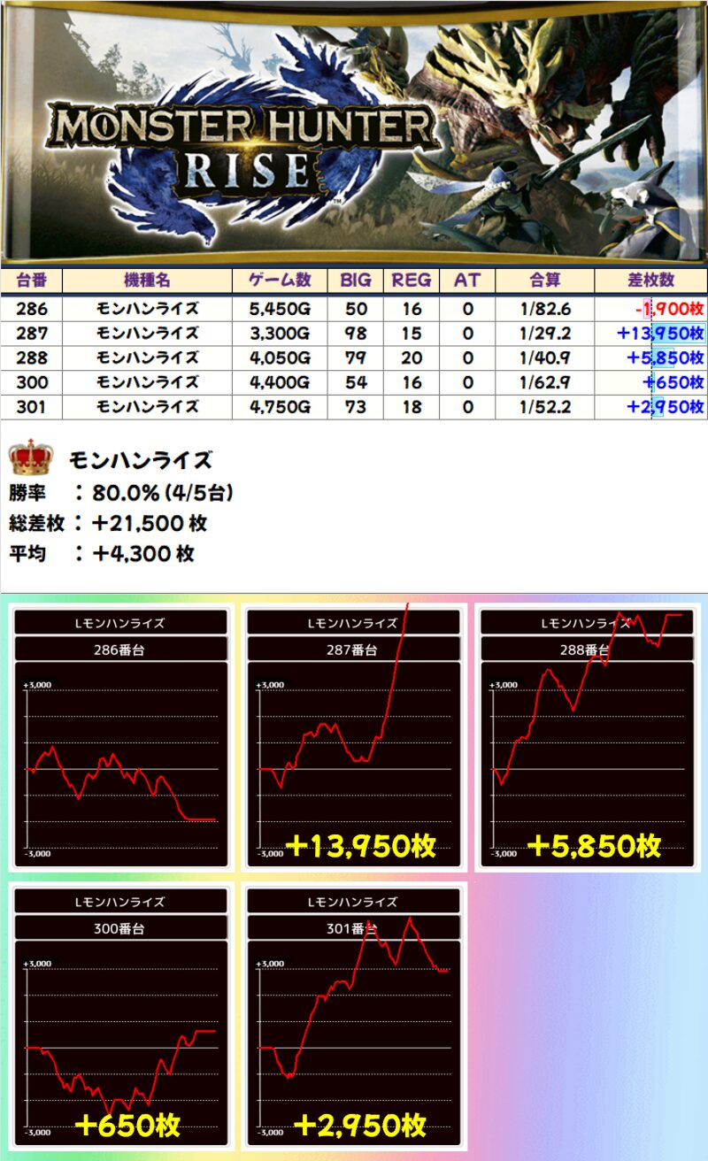 【全台系濃厚】モンハンライズ(4/5台)|平均+4300枚