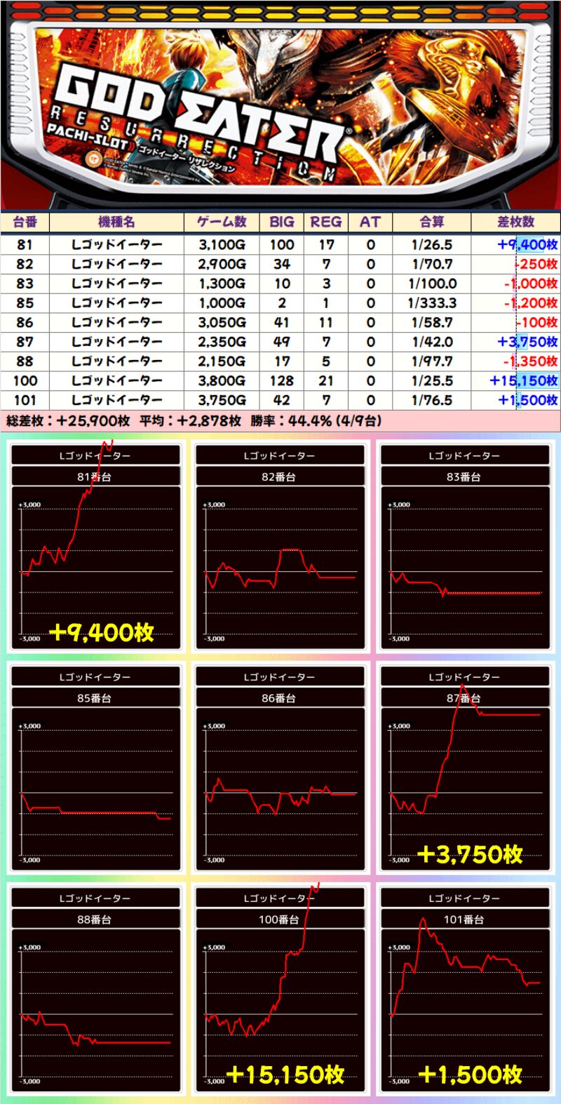 【高配分】Lゴッドイーター(4/9台)|平均+2878枚
