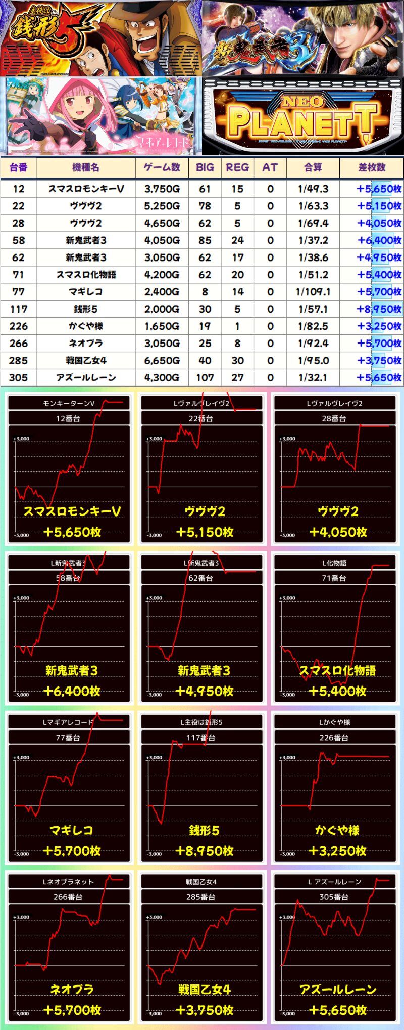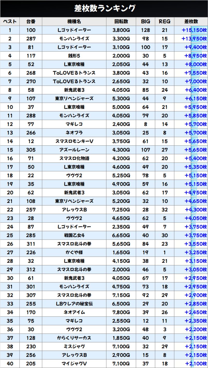 その他にも仕掛け台を中心に様々な機種がランキング上位に並び、+2000枚以上を記録した台が40台ありました!