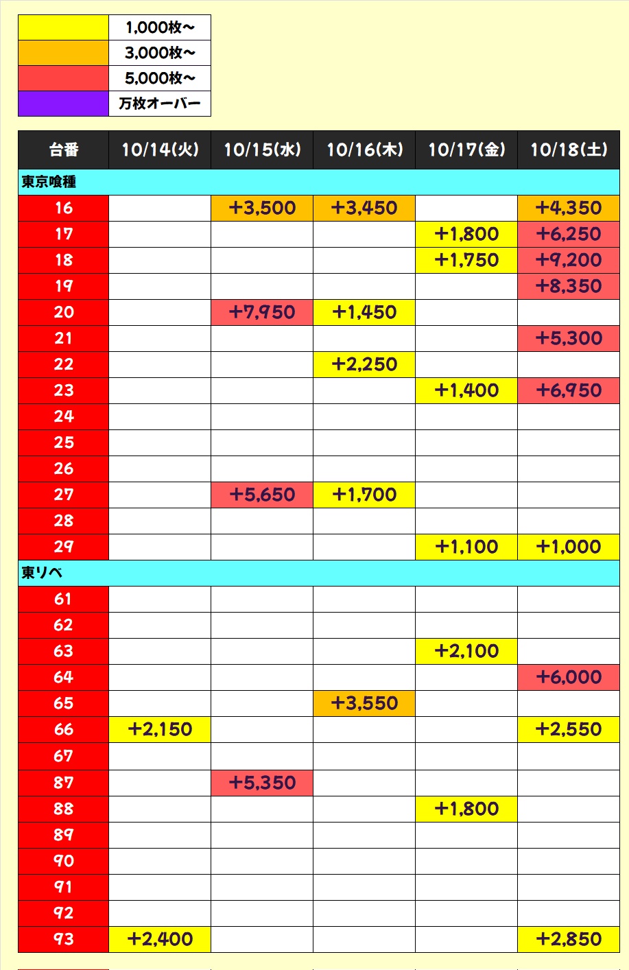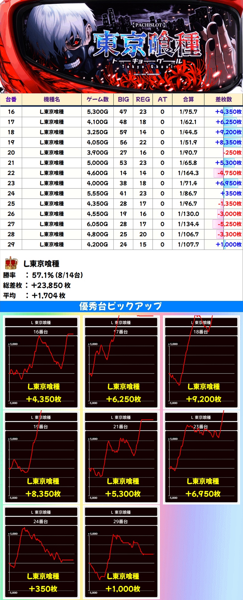 やはりグランパ大久保の東京喰種は状況が良く、今回は14台中8台がプラスの高配分候補。8の日はもちろん、その他の日でも好結果が数多く登場する機種なので、今後も目が離せません!
