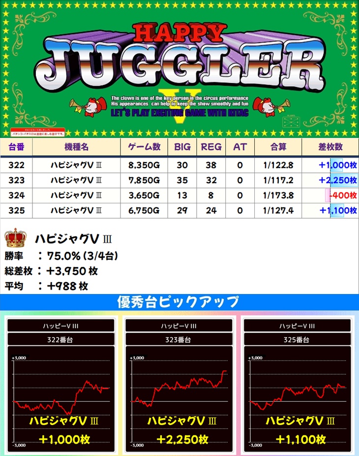 🌈ハッピージャグラー(4台)【平均+988枚】