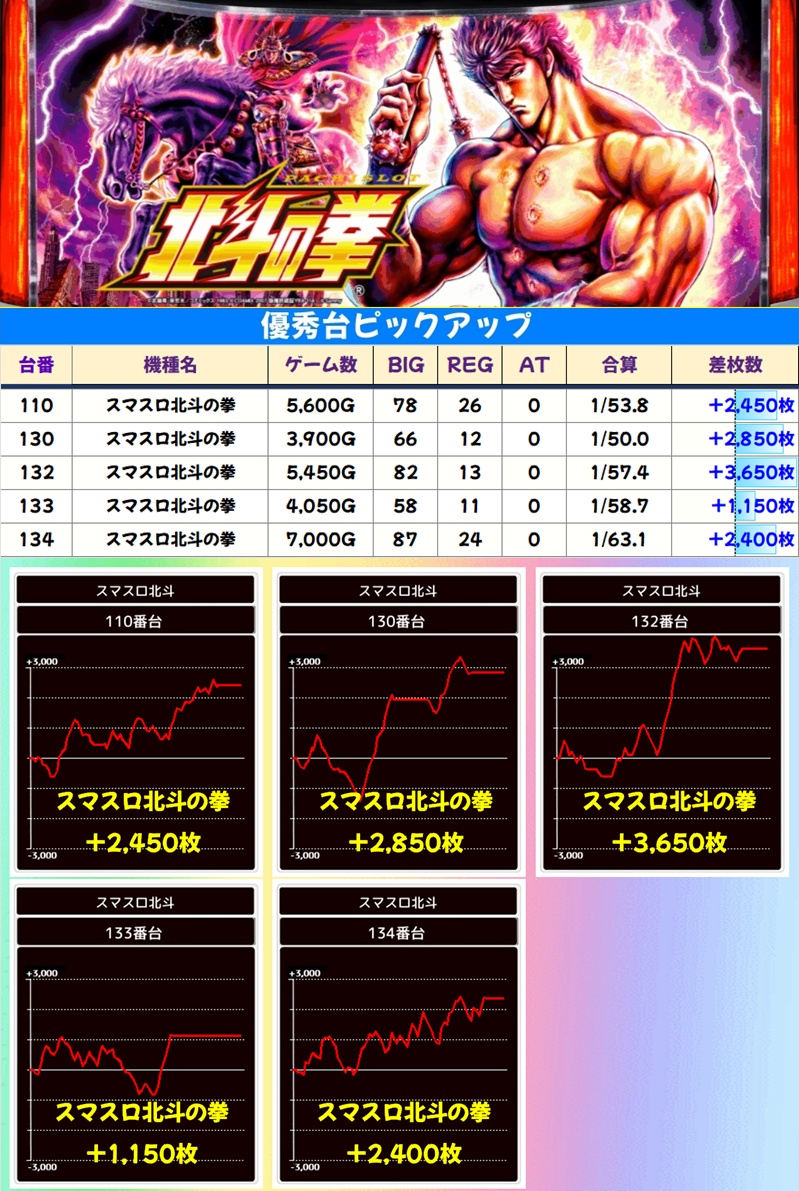 多台数機種の【スマスロ北斗】【マイジャグ】【ゴージャグ】からも優秀台が数多く登場。これらの機種は看板機種として扱われているので、迷った場合はまずはココへ!