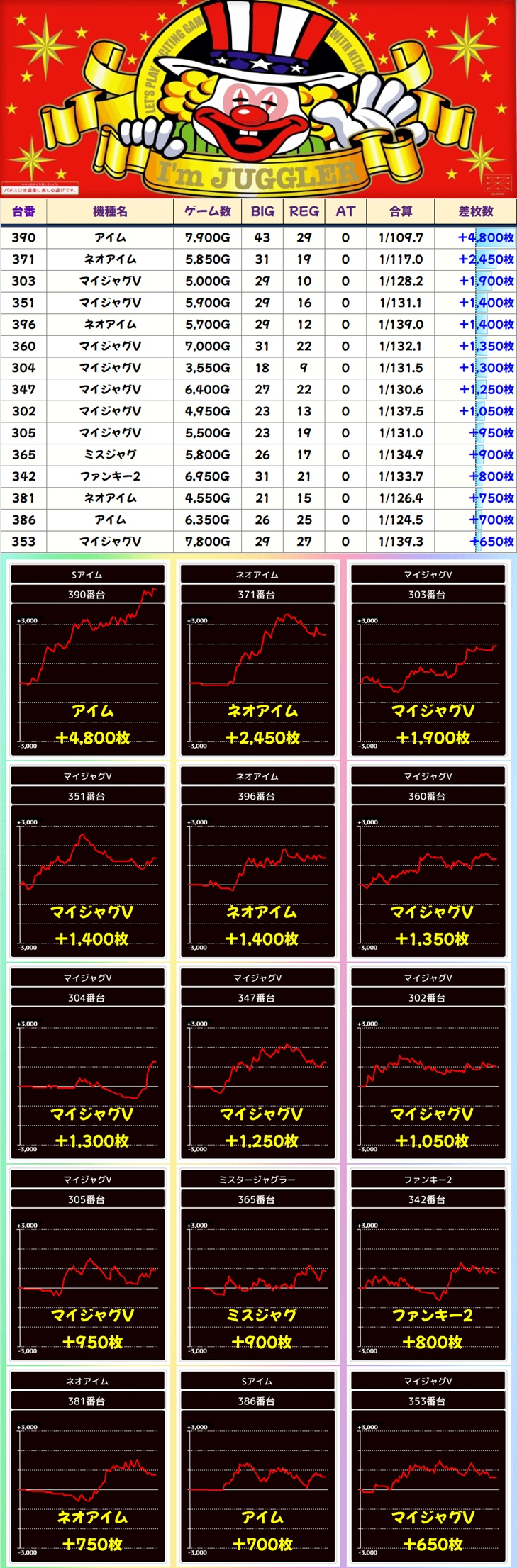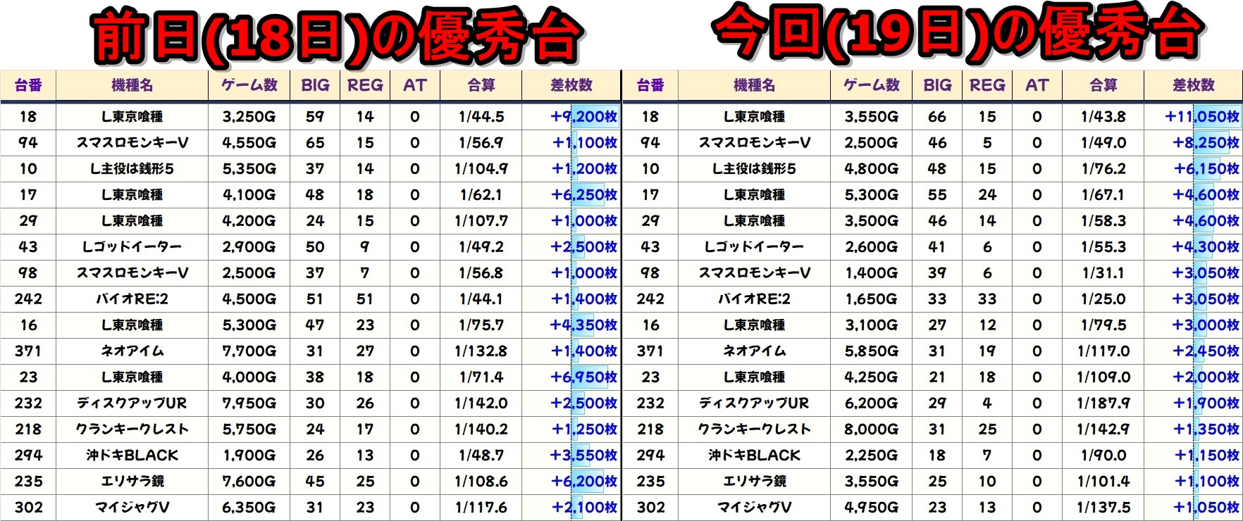 多台数の【マイジャグ】はもちろん、各ジャグ系から優秀台が数多く登場。前日優秀台の据え置きも多くありそうなので、18日の翌日も狙い目になると言えるでしょう!