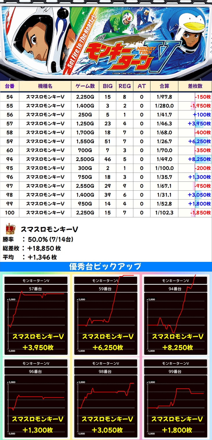 人気機種の【モンキーターン】、ノーマルタイプの【バーサスリヴァイズ】【クランキークレスト】、そして沖スロの【沖ドキGOLD】は優秀台が多数あり!様々なタイプが期待できるキングパパならではの仕掛け候補だった可能性が高いです。バーサスリヴァイズは先月(9/19)も仕掛け候補だったので、来月(11/19)も気になるところです。