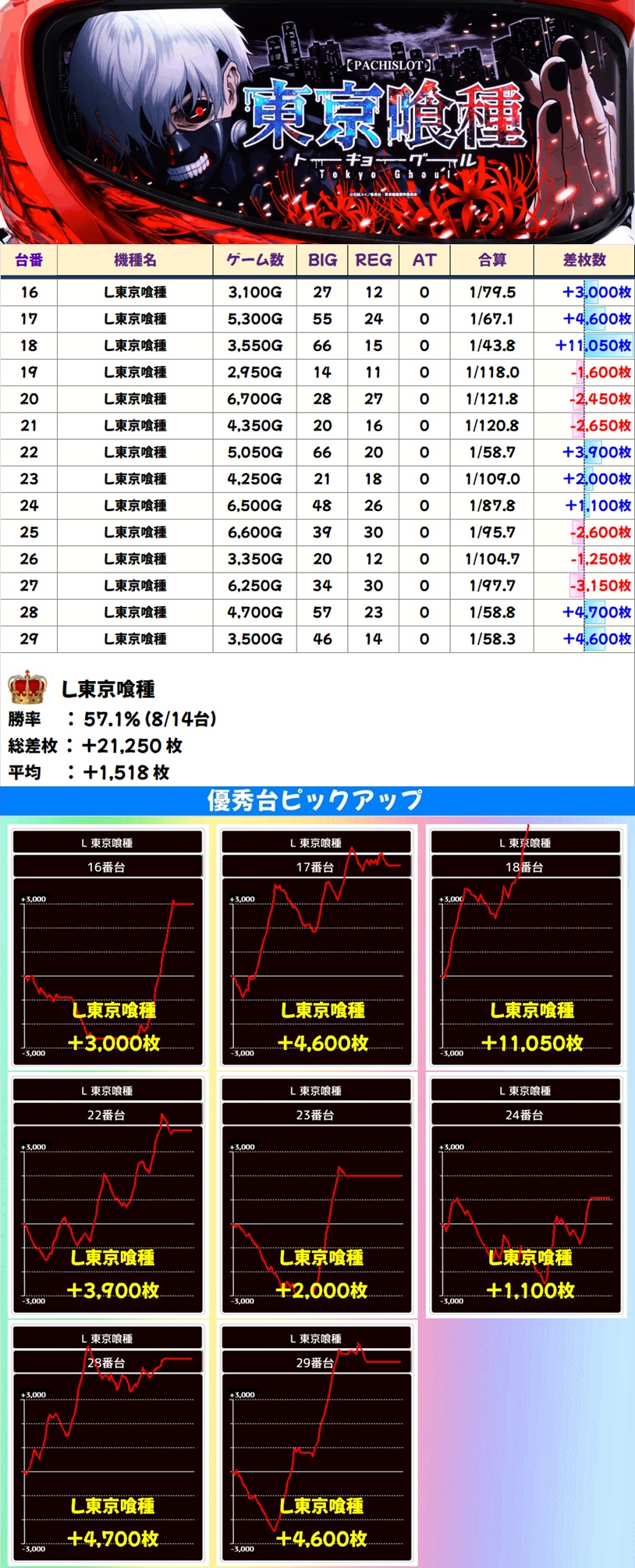 【東京喰種】は万枚を筆頭に14台中8台がプラスだったので、高配分以上だった可能性大!マギレコも不発気味ではありますが、6台中3台が挙動が良さそう+かなり粘られていたので、こちらも高配分以上で間違いなさそうです!