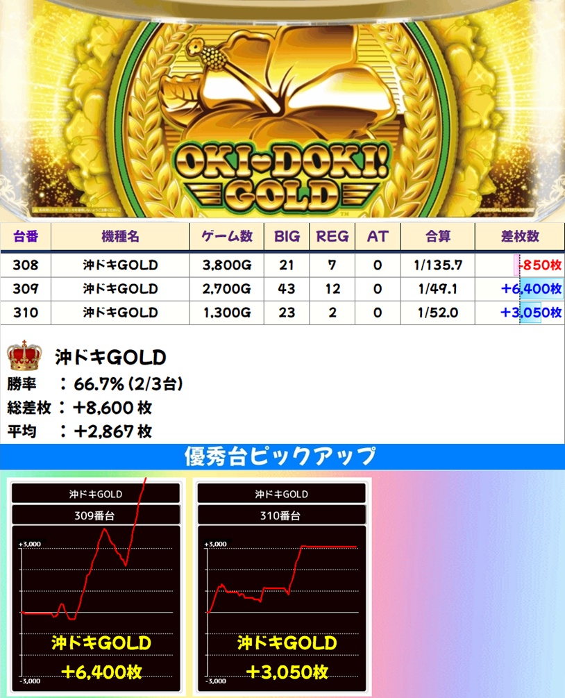 🌈沖ドキGOLD(3台)【平均+2867枚】