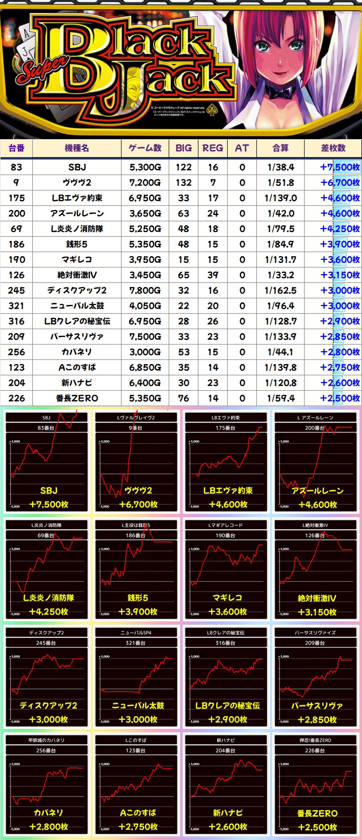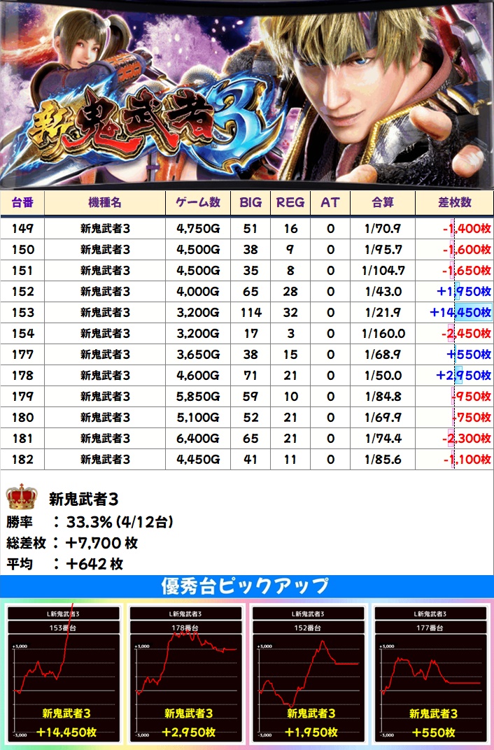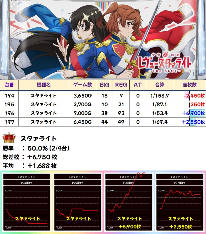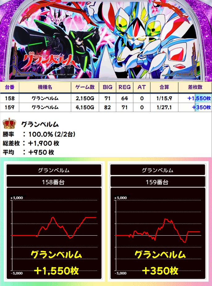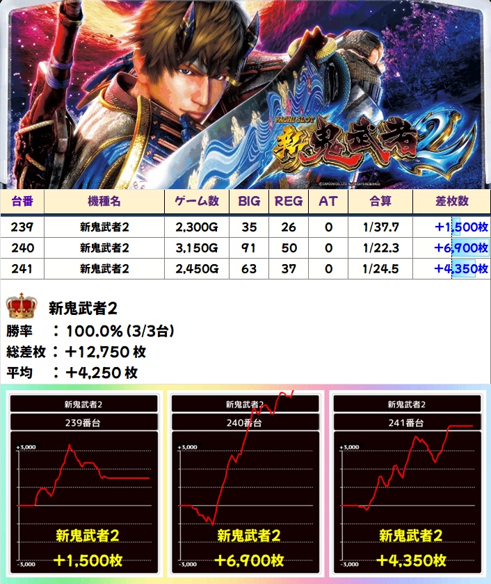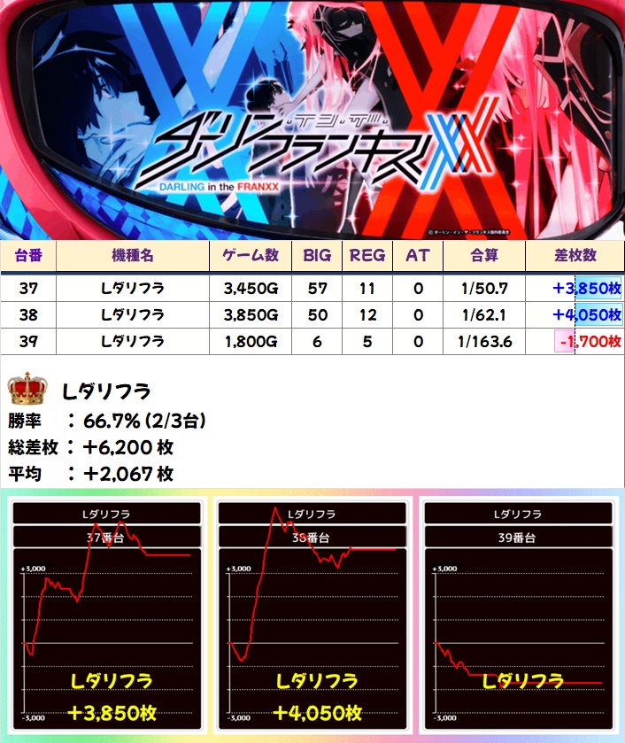 そして【新鬼武者2】【グランベルム】は全台系候補と思わせる高挙動だったり、【Lダリフラ】【防振り】【スタァライト】【スマスロバジ絆2】からも各機種で複数の優秀台を確認できただけに高配分機種でしたね!