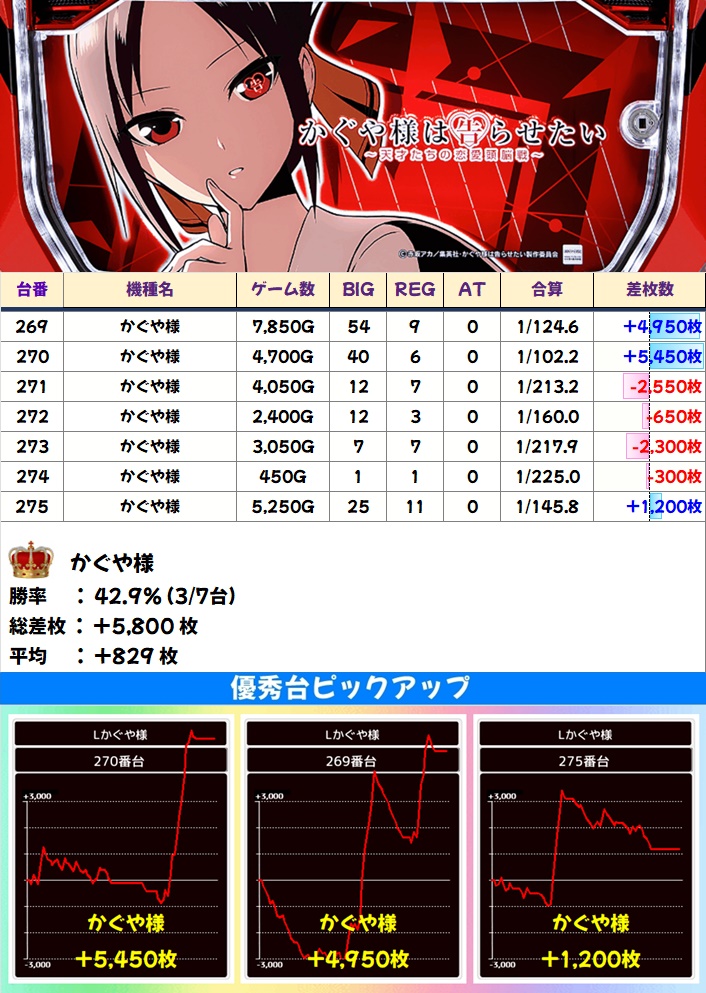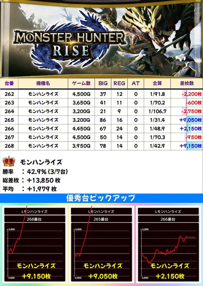 設置台数7台以上の人気機種【Lゴッドイーター】【モンハンライズ】【東京リベンジャーズ】【スマスロモンキーV】【かぐや様】からは各機種で優秀台を多数確認!ゴッドイーターからは万枚オーバー台が3台も!東京リベンジャーズ&モンキーからも万枚オーバー&モンハンライズからは+9000枚オーバー×2だったりと、かなりの盛り上がりを見せていました!