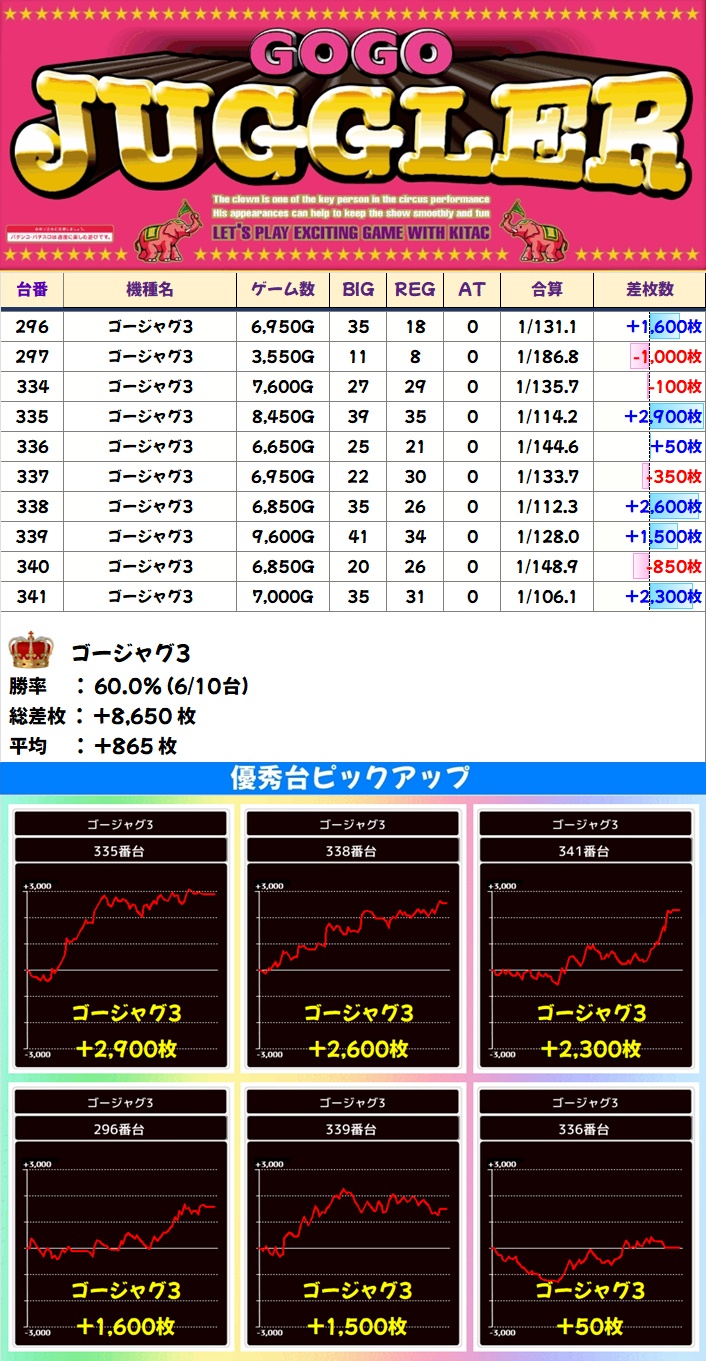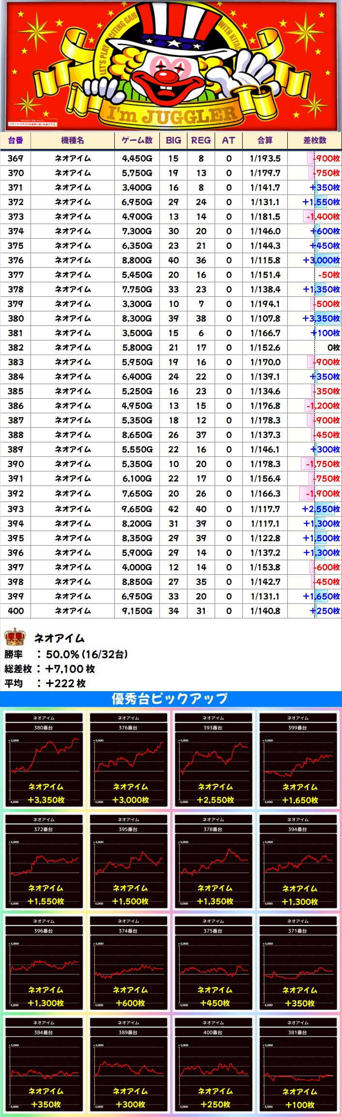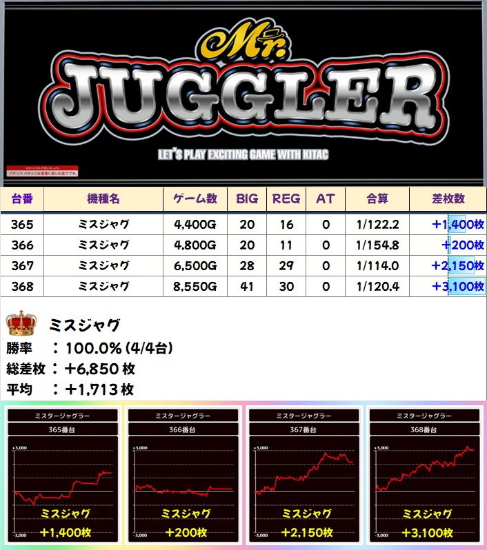 今回の全台系候補は【ミスジャグ】で間違いなし!その他も看板のマイジャグ&ネオアイムを筆頭に各機種で多数の優秀台を確認!ジャグラーガールズは不発気味に終わってしまっただけに次回のリベンジに期待ですね!
