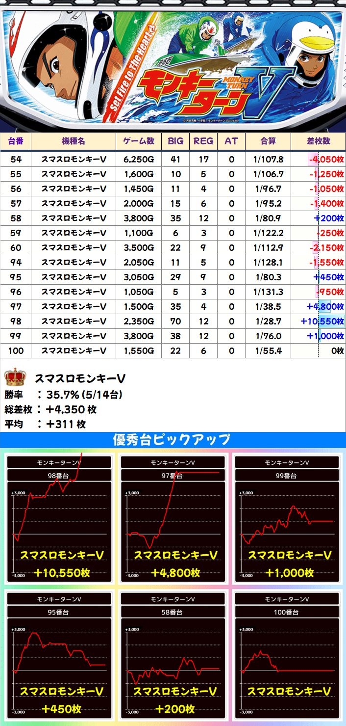 🌈スマスロモンキーV(14台)【平均+311枚】