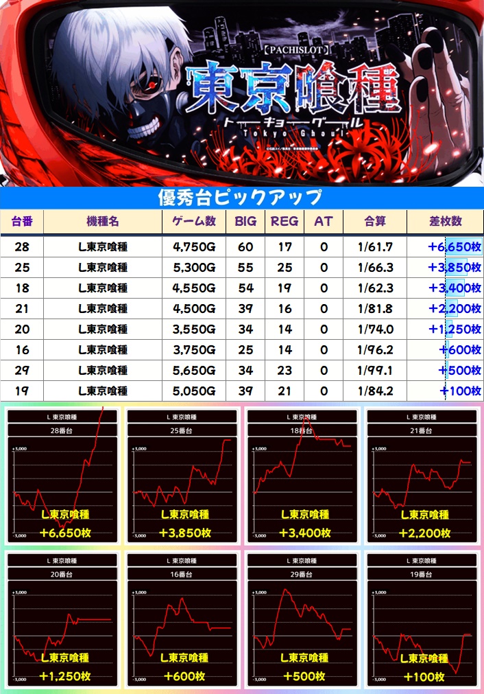 そして推すすめの【東京喰種】【新鬼武者3】からは新鬼武者3から万枚オーバーだったり、その他の主要機種からも万枚オーバー台を多数確認!全台系や高配分機種も多数と、今回もしっかりと仕掛け満載な⑧の日となりましたね!