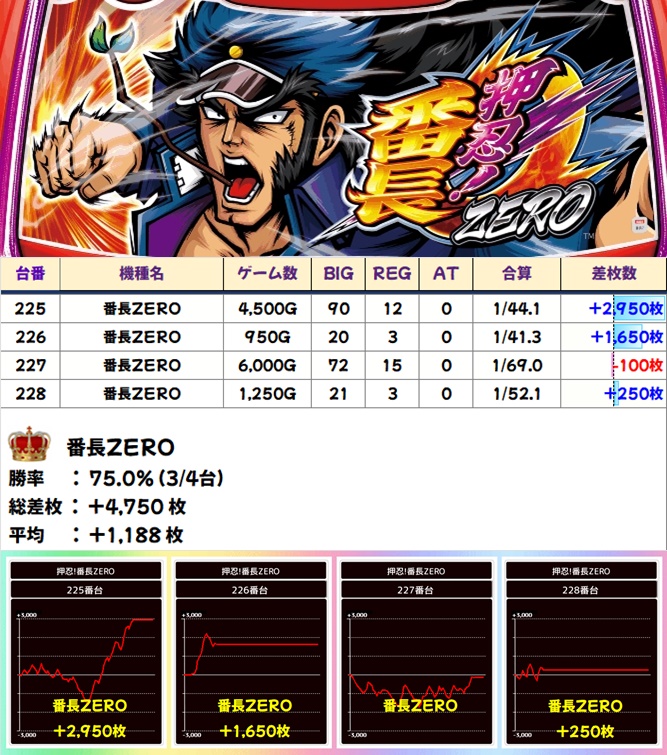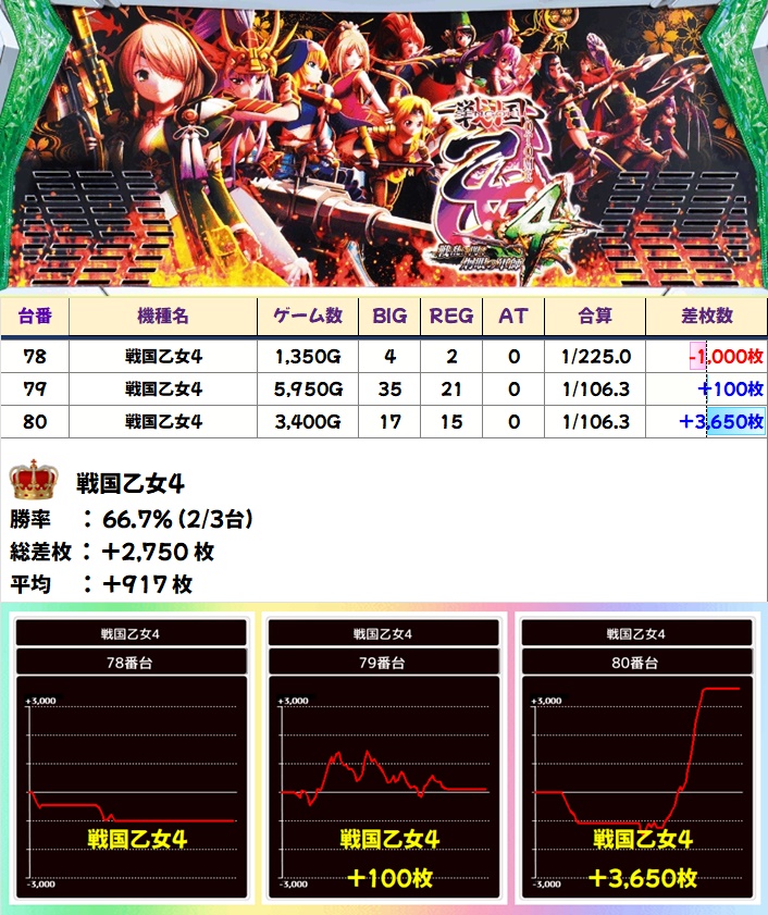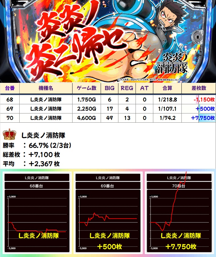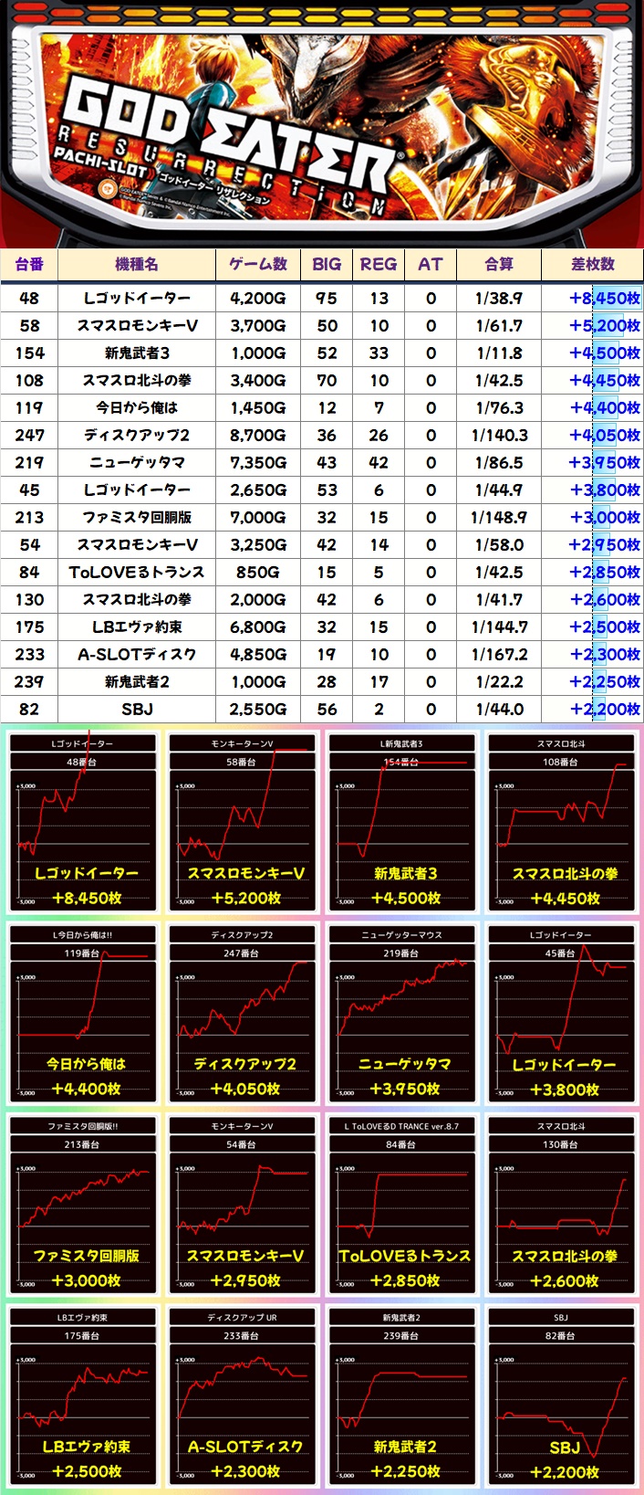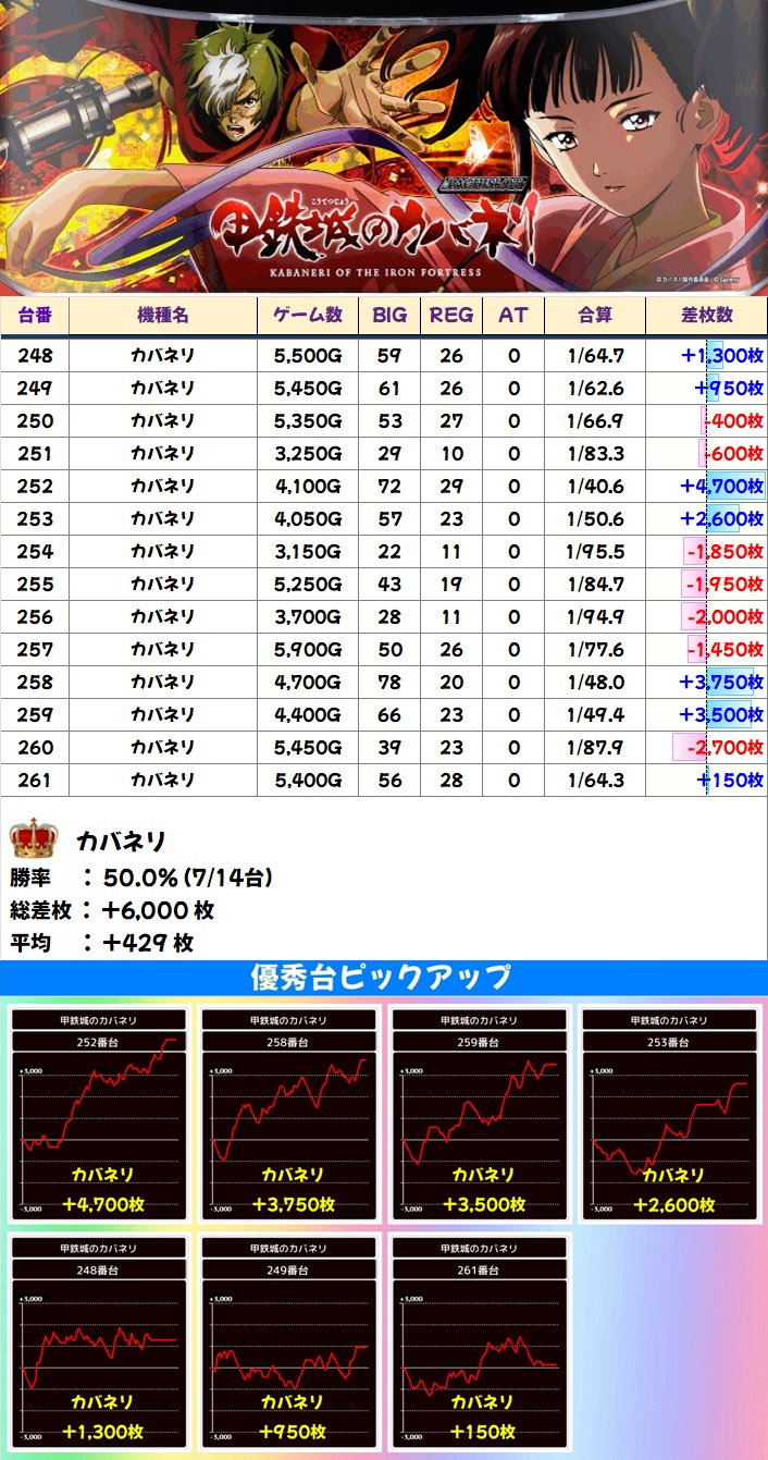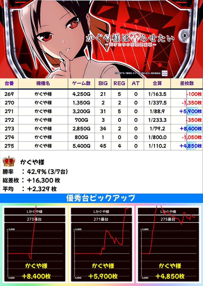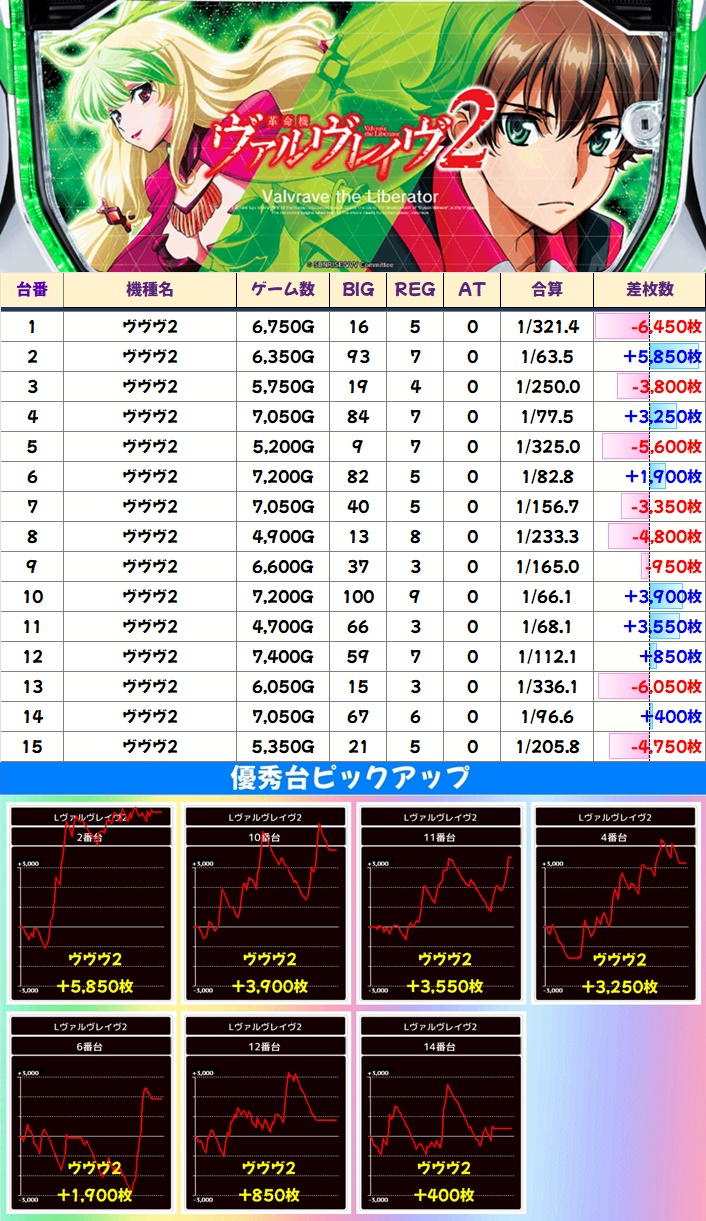 【LBクレアの秘宝伝】の全台プラスを筆頭に【かぐや様】【L炎炎ノ消防隊】【ヴヴヴ2】【戦国乙女4】【番長ZERO】と、各機種で多数の優秀台を確認!今後メイン機種になっていくであろうヴヴヴ2は今後も要チェックですね!